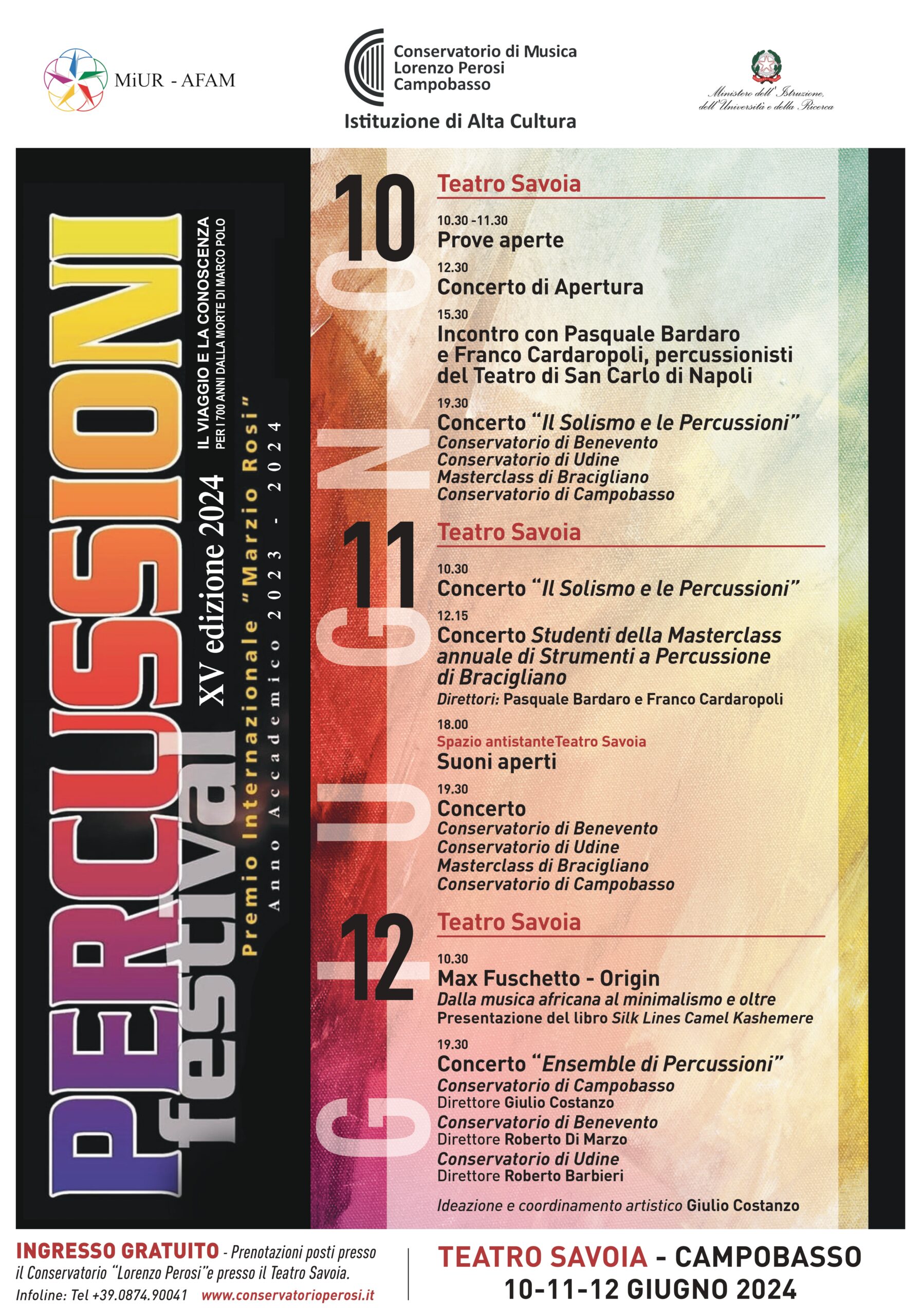 È Festivalpercussioni, il festival ideato e diretto da Giulio Costanzo, docente di Strumenti a Percussione del Conservatorio “Perosi” di Campobasso, che quest’anno raggiunge la XV edizione, risultando la manifestazione più longeva dell’Istituzione di Alta Formazione Artistica e Musicale del capoluogo molisano, e che quest’anno è dedicata al viaggio ed alla conoscenza per i 700 anni dalla morte di Marco Polo.
