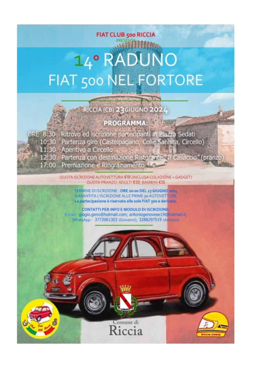Il 23 giugno il Comune di Riccia presterà la sua scenografia naturale al 14° raduno della Fiat 500 e dalle 8:30 tutti i partecipati potranno ritrovarsi ed iscriversi presso Piazza Sedati, mentre alle 10:30 prenderà avvio il giro che interesserà Castelpagano, Colle Sannita per giungere poi a Circello intorno alle 11:30 dove si sosterà per un aperitivo. Il pranzo, previsto per le 12:30 presso il Ristorante ‘Il Casaccio’, sarà poi seguito dalla premiazione che avverrà intorno alle 17:00.