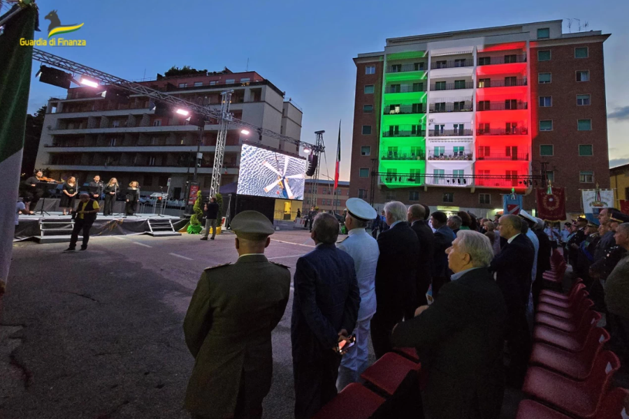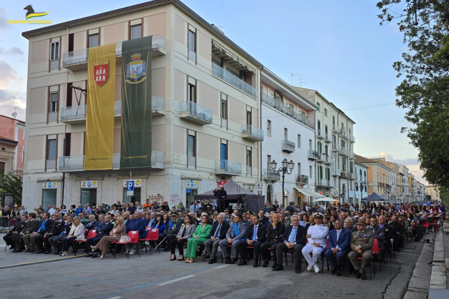 Le celebrazioni sono proseguite poi con una cerimonia organizzata in serata nella splendida cornice di Piazza della Vittoria a Campobasso, alla presenza delle massime autorità civili, militari e religiose della Regione, di un’aliquota di militari in servizio e in congedo, dei rappresentanti delle Associazioni professionali a carattere sindacale tra i militari della Guardia di Finanza, nonché, a testimonianza della forte unione con le Istituzioni locali, dei Gonfaloni della Regione Molise, delle Province di Campobasso e Isernia e dei Comuni che ospitano o che hanno ospitato Reparti del Corpo, oltre ai Labari delle Associazioni combattentistiche e d’Arma. Hanno partecipato, inoltre, tutti i Finanzieri liberi dal servizio che unitamente ai loro familiari hanno così voluto festeggiare i due secoli e mezzo della Guardia di Finanza. In tale contesto, successivamente alla cerimonia dell’“Alzabandiera”, è stata data lettura del messaggio augurale del Presidente della Repubblica, Sergio Mattarella, e dell’“Ordine del giorno speciale” del Comandante Generale della Guardia di Finanza, Generale di Corpo d’Armata Andrea De Gennaro.