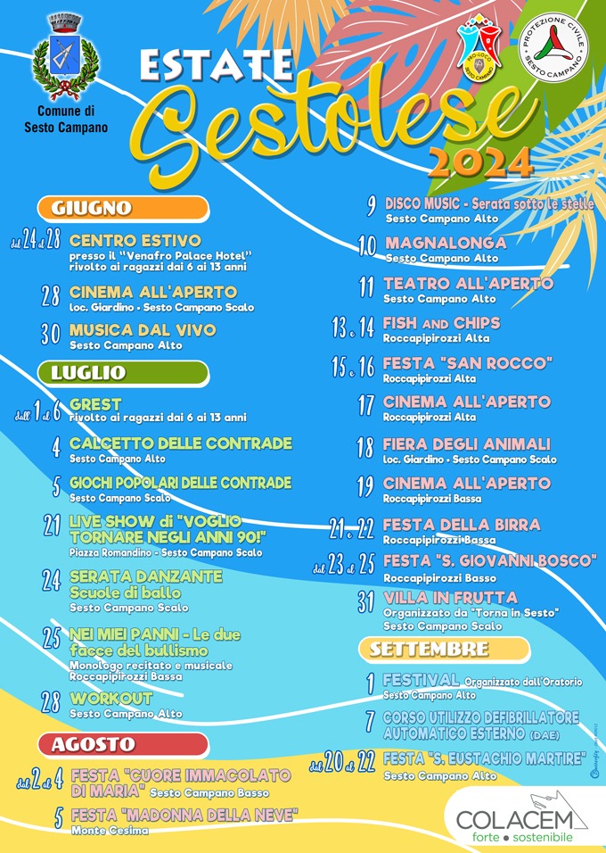 SESTO CAMPANO – Una grande varietà di appuntamenti, che si svolgeranno da giugno a settembre sia in paese che nelle frazioni, per una stagione da vivere insieme.