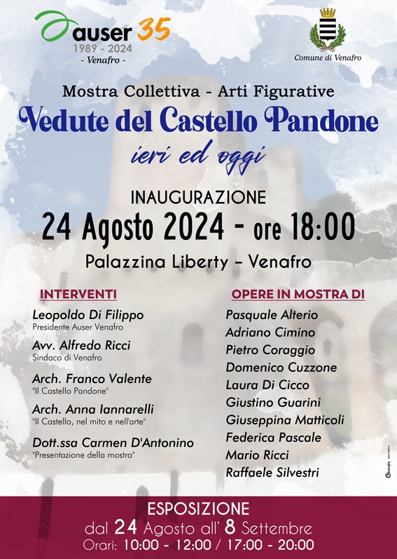 Organizzata da Auser Venafro APS, la mostra sarà inaugurata sabato 24 agosto alle ore 18:00 presso la Palazzina Liberty di Venafro, un altro edificio caratteristico della città, noto per la sua architettura e ubicazione suggestiva.