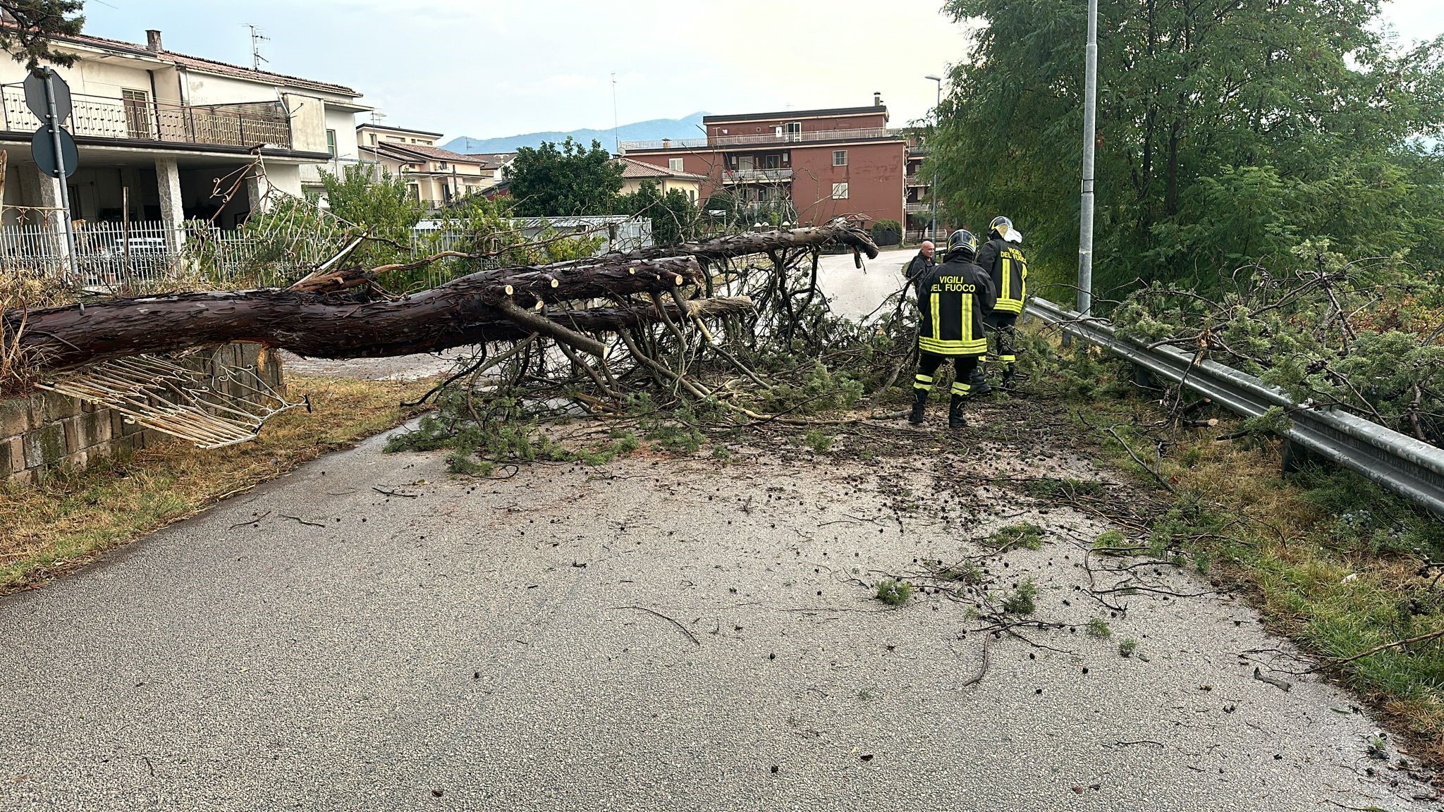 POZZILLITragedia sfiorata su via Stradella, dove intorno alle 17:30 di oggi, lunedì 26 agosto, un grosso pino è crollato sulla sede stradale, abbattendo la recinzione di un fabbricato.