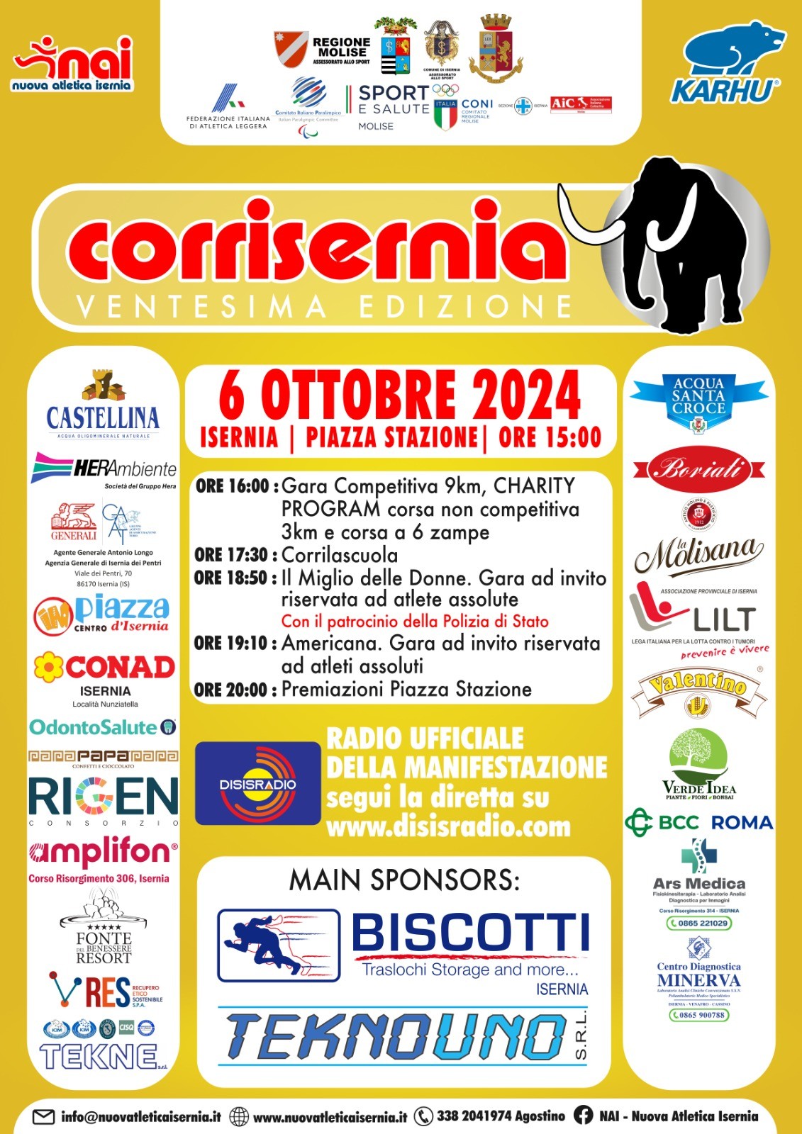 ore 16,00 gara competitiva di 9 km, in coda alla quale partiranno la non competitiva, il charity programm e la corsa a 6 zampe, in collaborazione con la locale sezione dell’Enpa; a seguire alle ore 17,30 il Corrilascuola, la competizione diretta agli istituti scolastici della città e dell’intera provincia di Isernia e che tornerà ad animare i vicoli del centro storico; si proseguirà alle ore 18,50 con “il miglio delle donne” gara ad inviti riservata ad atlete della categoria assolute e patrocinata, anche quest’anno, dalla Polizia di Stato nell’ambito del programma “Questo non è amore” – campagna di sensibilizzazione e consapevolezza contro la violenza sulle donne; infine alle ore 19,10 la gara all’Americana che vedrà ai nastri di partenza alcuni dei protagonisti delle recenti Olimpiadi di Parigi.