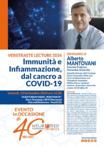 Nell’ambito delle celebrazioni per i 40 anni del riconoscimento del Neuromed come Istituto di Ricovero e Cura a Carattere Scientifico, il Professor Alberto Mantovani, uno dei più influenti immunologi a livello internazionale, terrà una conferenza dal titolo “Immunità e infiammazione: dal cancro a COVID-19”.