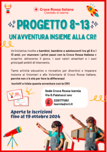 ISERNIA – Il Comitato della Croce Rossa Italiana comunica che fino al prossimo 18 ottobre è possibile iscriversi al Progetto 8-13, un programma pensato per ragazzi e ragazze di età compresa tra gli 8 e i 13 anni.