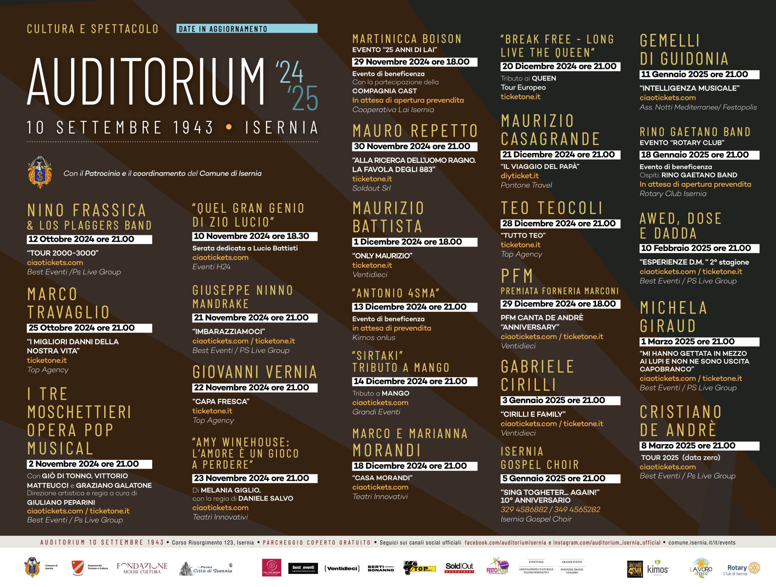 Dopo il grande successo della stagione 2023/2024, anche quest’anno le più importanti aziende di produzione ed organizzazione di eventi hanno scelto l’Auditorium isernino per alcune fra le tappe più importanti di artisti di primo piano nel panorama culturale e dell’entertainment più in generale.