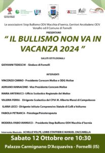 Le due associazioni Stop Bullismo Odv Macchia d’Isernia e Genitori Arcobaleno Odv Venafro continuano con il programma di sensibilizzazione contro il bullismo e cyberbullismo, sabato 12 ottobre alle ore 10:30 faranno tappa nel comune di Fornelli nella sala del Palazzo Carmignano D’Acquaviva.