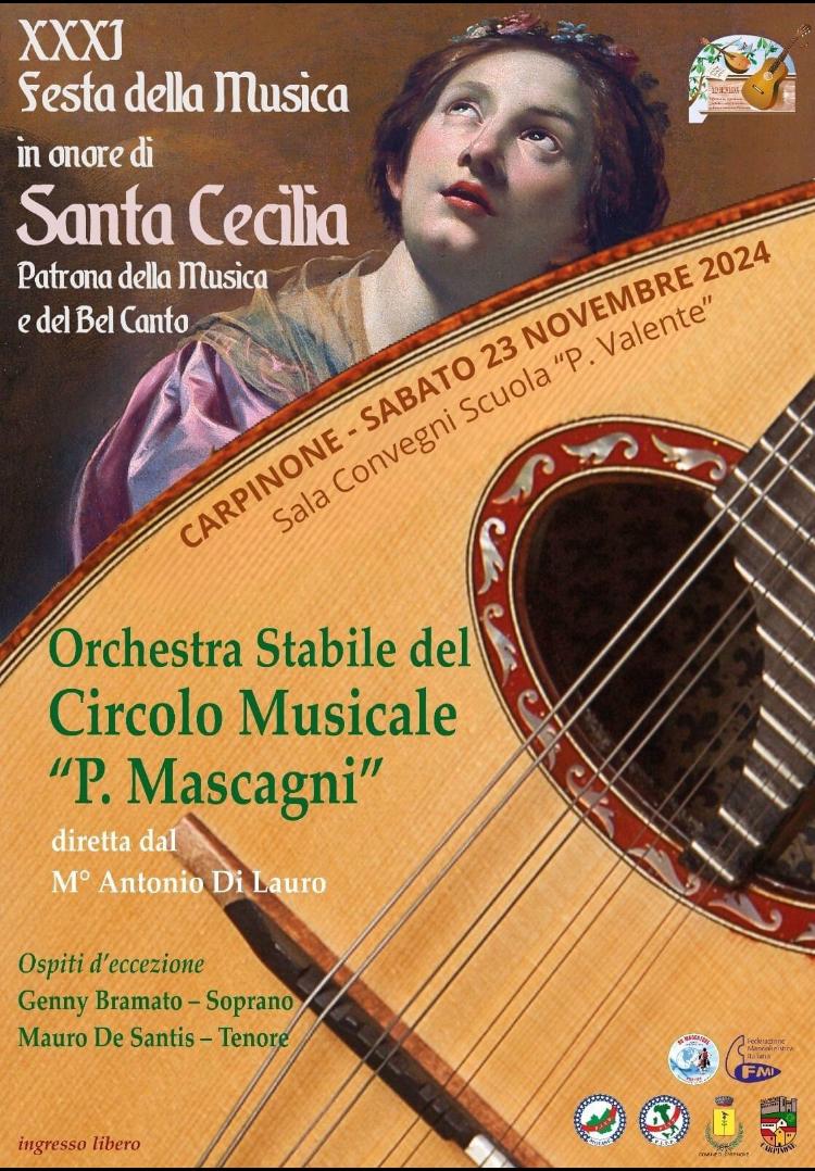 CARPINONE – Sabato 23 Novembre alle ore 18.00, presso la Sala Convegni della Scuola “P. Valente” di Carpinone, il Circolo Musicale “P. Mascagni” di Ripalimosani celebrerà la XXXI edizione della Festa della Musica, con un concerto in onore di Santa Cecilia, patrona della Musica e del Bel Canto.
