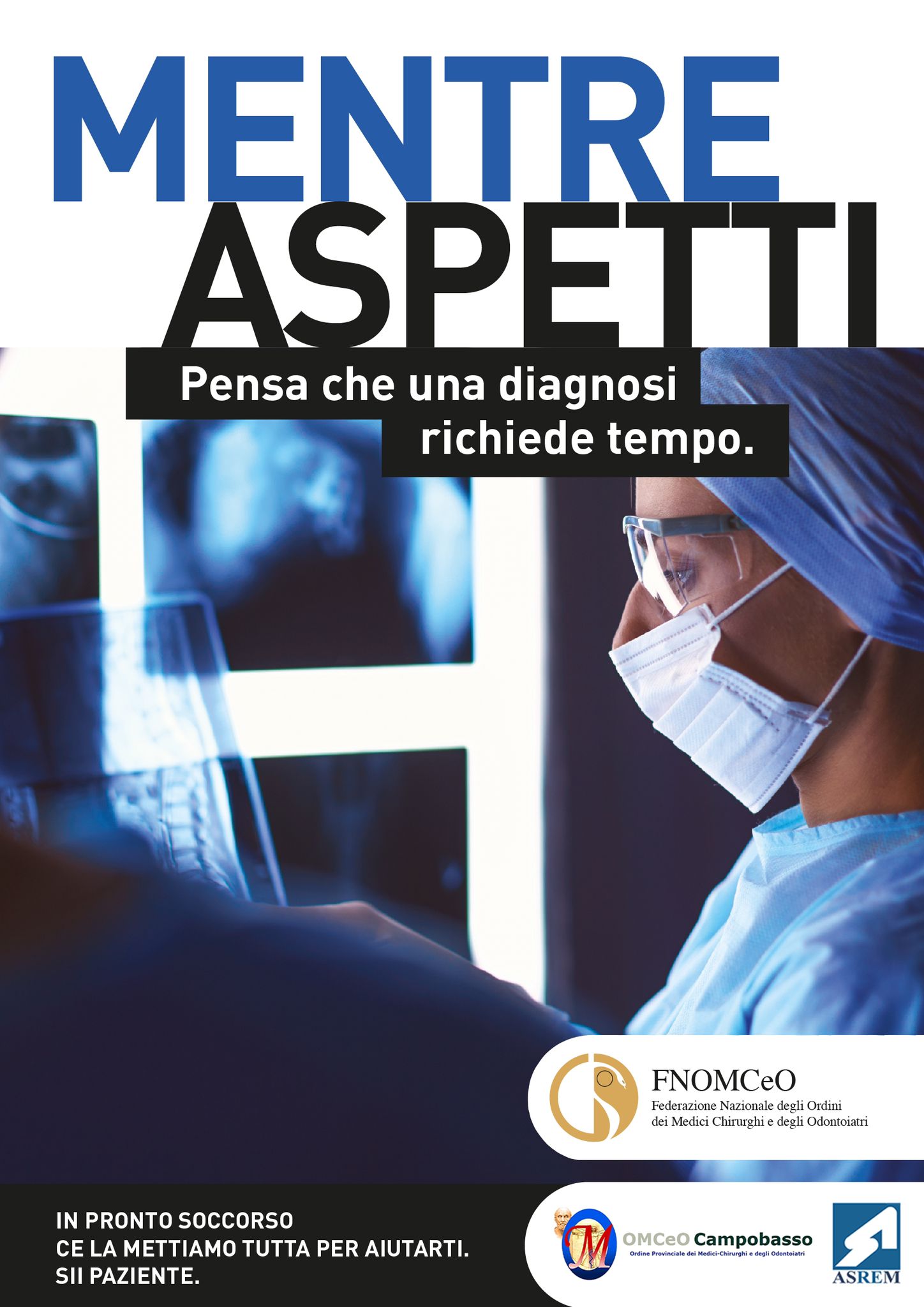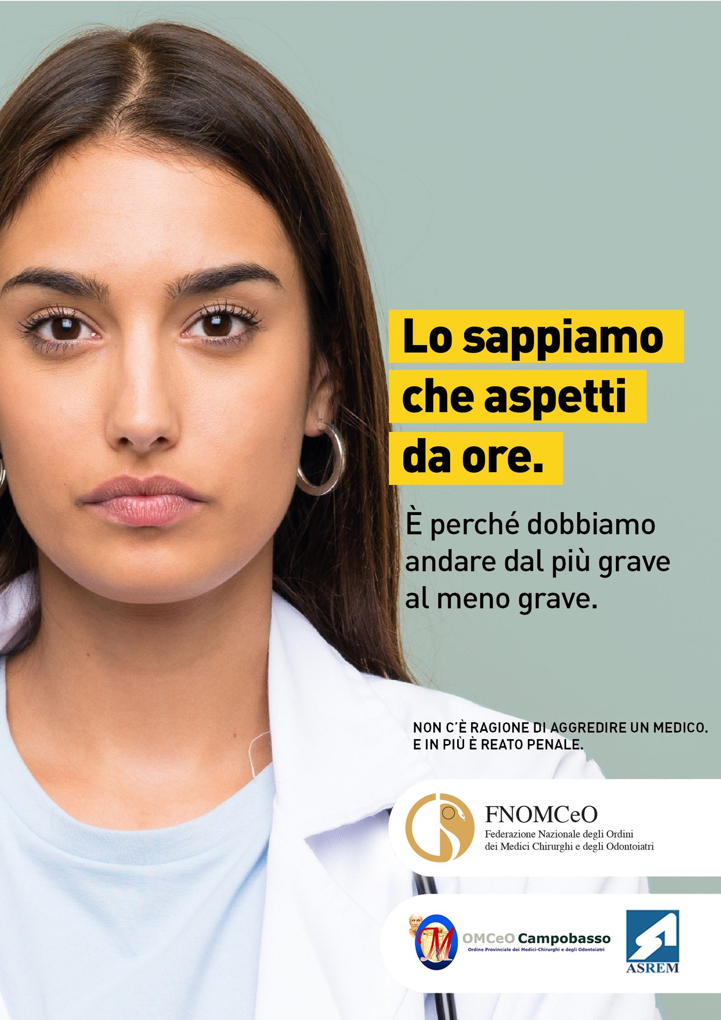 CAMPOBASSO – Quattro manifesti per sensibilizzare la popolazione contro i fenomeni di violenza verso medici e sanitari nei pronto soccorso. L’ASReM ha accolto la campagna promossa dall’OMCeO di Campobasso sottolineando le azioni intraprese nel tempo proprio per scongiurare liti ed aggressioni nei nosocomi.