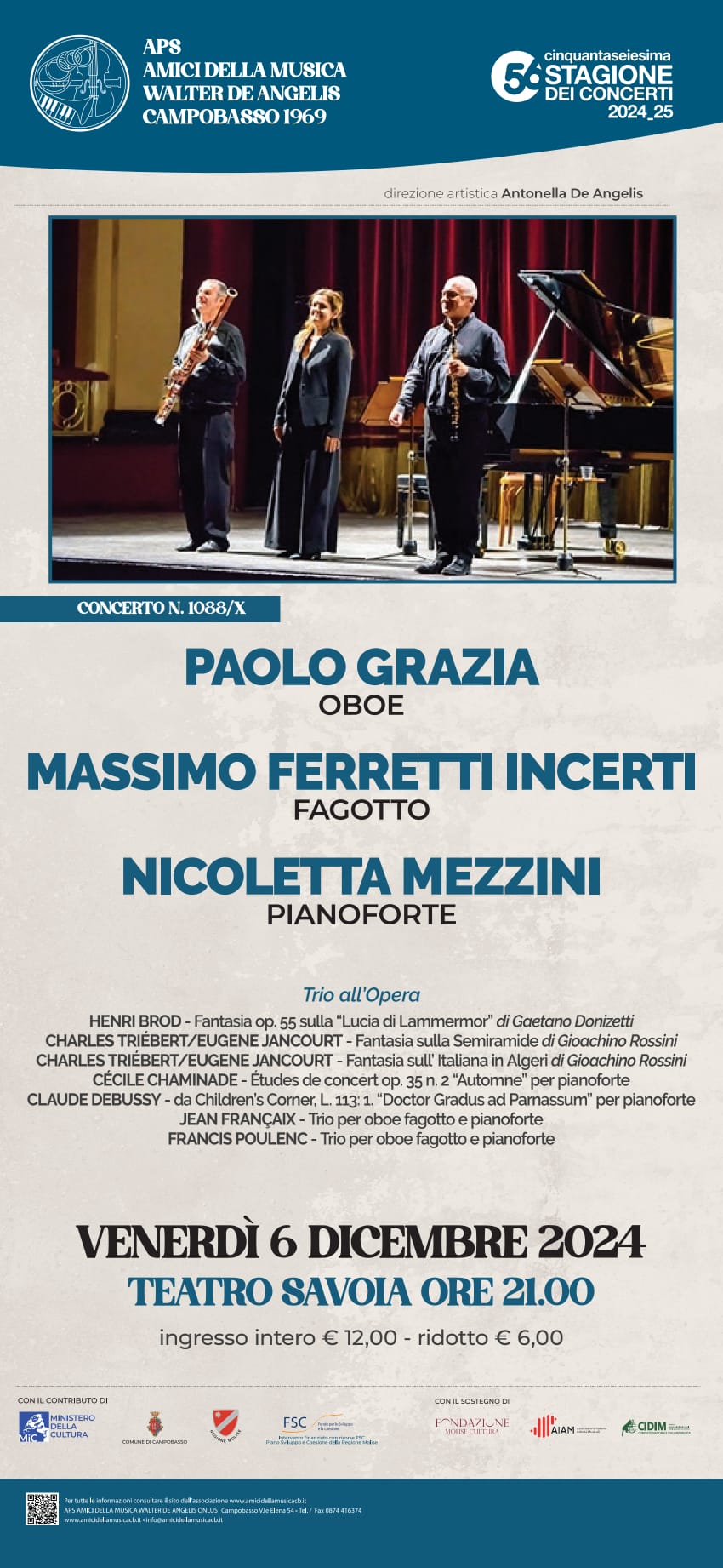 CAMPOBASSO – Domani, venerdì 6 dicembre alle 21,00 al Teatro Savoia, prosegue la stagione concertistica dell’Associazione Amici della Musica Walter De Angelis con Paolo Grazia all’oboe, Massimo Ferretti Incerti al fagotto e Nicoletta Mezzini al pianoforte.