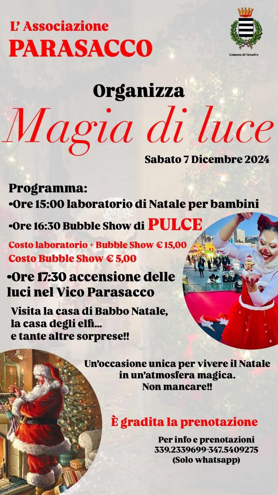 VENAFRO – L’Associazione ‘Parasacco’ presenta ‘Magia di luce’, l’appuntamento natalizio che esalta la creatività dei grandi e dei bambini.