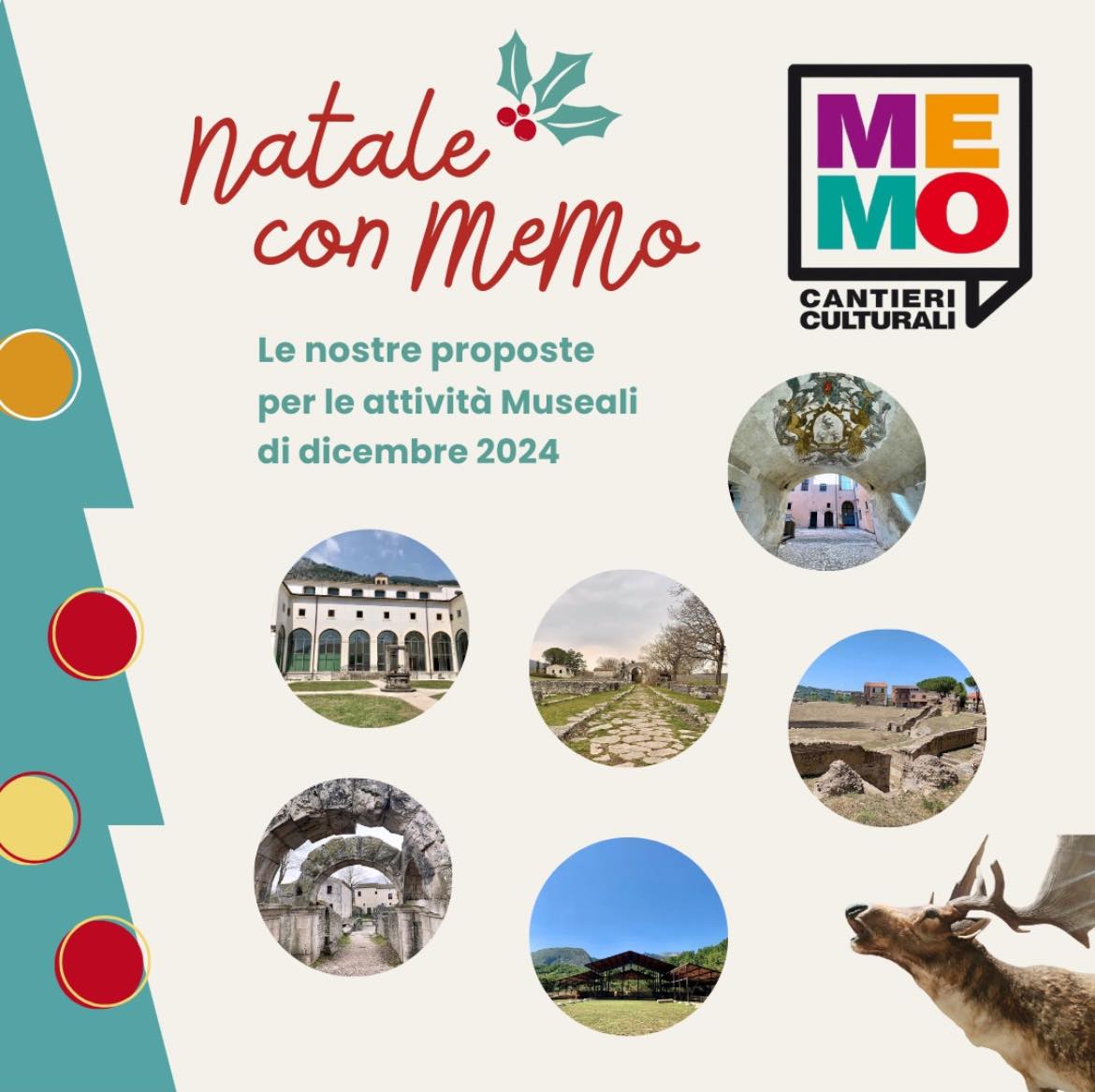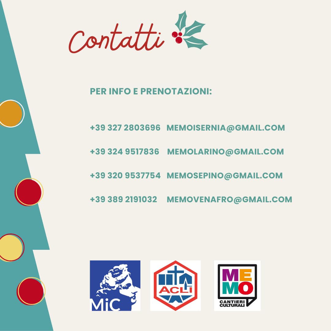 L’Associazione ‘Me.Mo Cantieri Culturali’, sempre attenta a promuovere offerte formative in grado di accrescere il sapere dei propri sostenitori senza mettere in secondo piano il divertimento e il piacere della condivisione, presenta il calendario delle attività museali natalizie e fornisce un elenco interessante dei tanti poli culturali situati in Molise coinvolti nel programma natalizio.