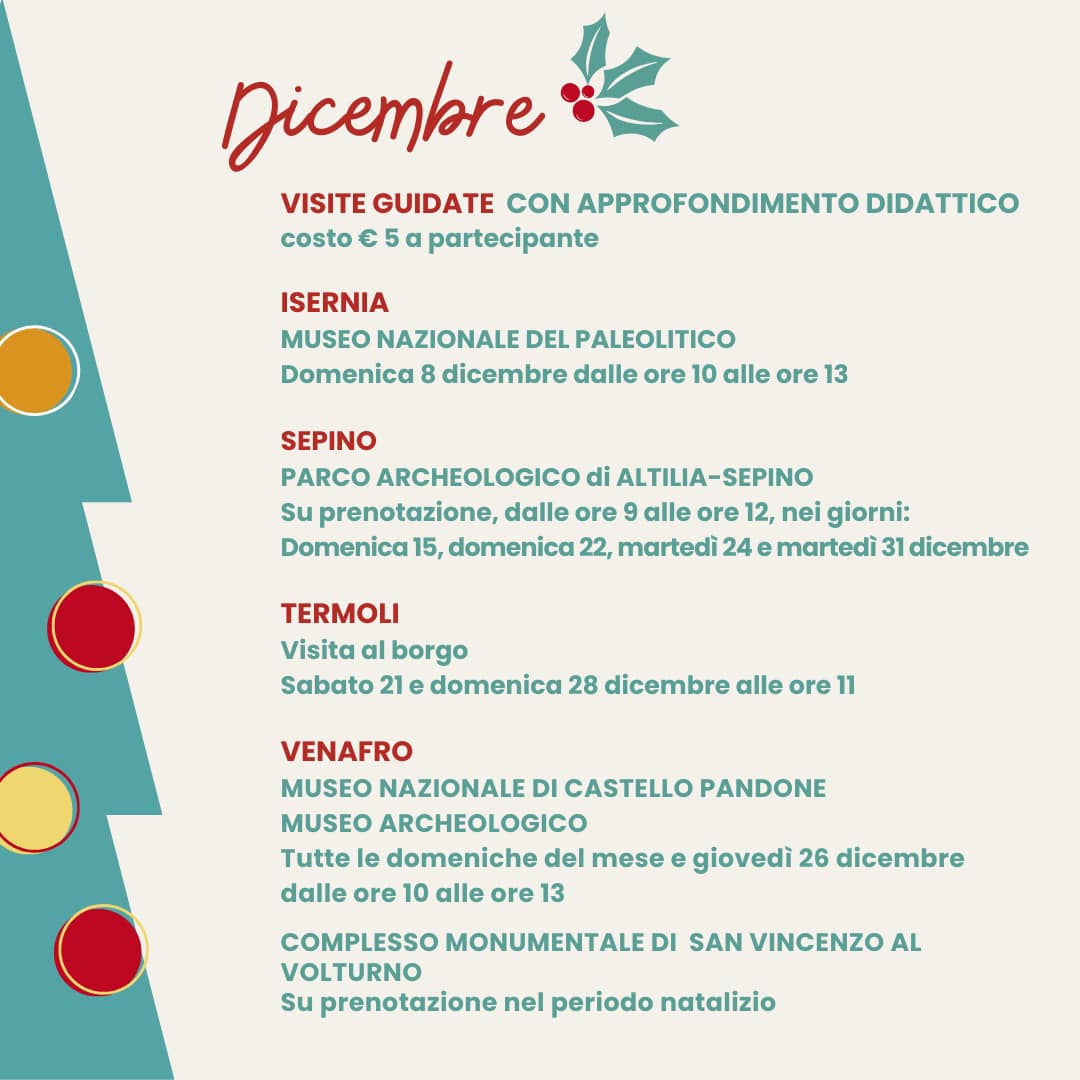 Le visite guidate con approfondimento didattico, per le quali è prevista la prenotazione e il contributo di cinque euro a partecipante, coinvolgeranno il ‘Parco Archeologico di Altilia-Sepino’ nei giorni di domenica 22, martedì 24 e martedì 31 dicembre dalle ore 9:00 alle ore 12:00. Presenti anche il borgo di Termoli, visitabile sabato 21 e domenica 28 dicembre alle ore 11:00 e il Complesso Monumentale di San Vincenzo Al Volturno.