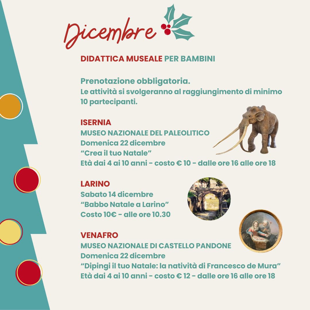 Così, il Museo Nazionale del Paleolitico di Isernia sarà il luogo preposto ad ospitare il progetto intitolato ‘Crea il tuo Natale’ che si svolgerà domenica 22 dicembre dalle ore 16:00 alle ore 18:00. Il progetto, rivolto ai bambini dai quattro ai dieci anni, prevede un contributo di dieci euro e la prenotazione obbligatoria; è previsto infatti che le attività si svolgeranno al raggiungimento di dieci partecipanti.