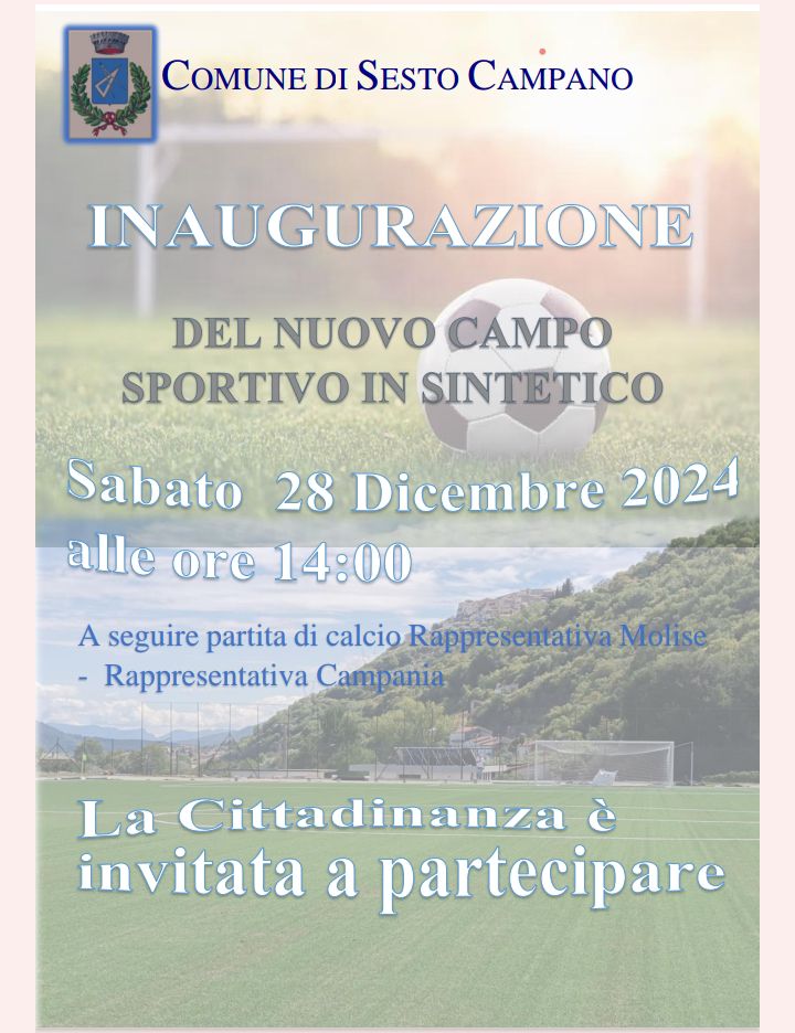 SESTO CAMPANO – Sarà una bellissima giornata quella che si respirerà domani 28 dicembre a Sesto Campano. Il campo sportivo comunale, completamente rinnovato, tornerà ad essere fruibile ed efficiente per tutte le attività sportive e per la società Sesto Campano Calcio.