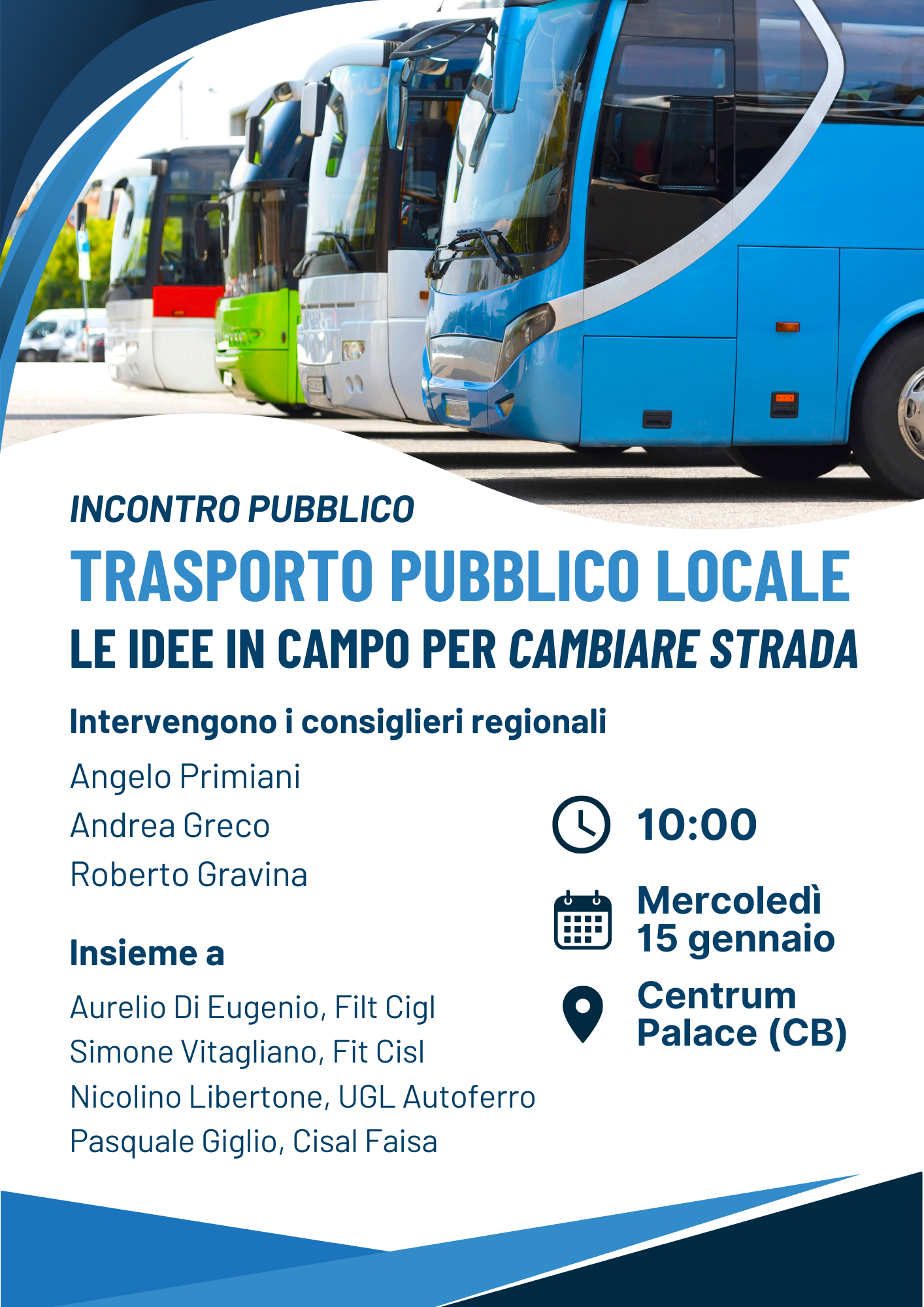 CAMPOBASSO – Mercoledì 15 gennaio, alle ore 10:00, presso un noto albergo della città si terrà un incontro pubblico dedicato al futuro del Trasporto pubblico locale.
