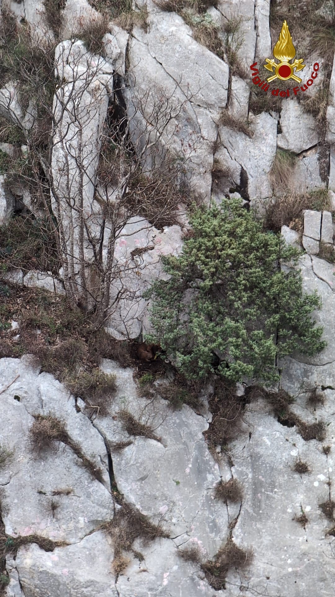 Per il recupero del cane, sul posto, sono intervenuti i Vigili del Fuoco. Dopo aver raggiunto la base della parete, hanno richiesto l’intervento di un elicottero che, a causa delle condizioni meteo avverse, non ha potuto operare direttamente. Tuttavia, l’elicottero ha permesso di localizzare esattamente il cane, che si era intanato in un anfratto della roccia.