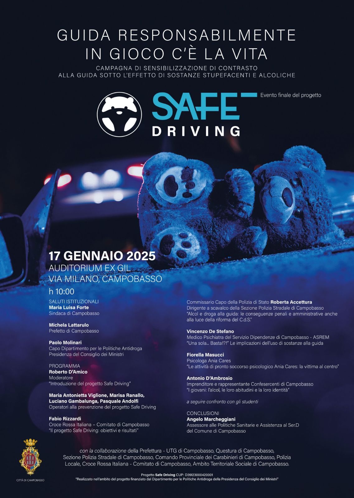 CAMPOBASSO – “Guida responsabilmente: in gioco c’è la vita” è l’evento conclusivo organizzato per venerdì 17 gennaio 2025, alle ore 10:00, presso l’Auditorium Ex GIL dal Comune di Campobasso nell’ambito del progetto “Safe Driving”, finanziato dalla Presidenza del Consiglio dei ministri – Dipartimento per le Politiche antidroga, attraverso il “Fondo contro l’incidentalità notturna”.