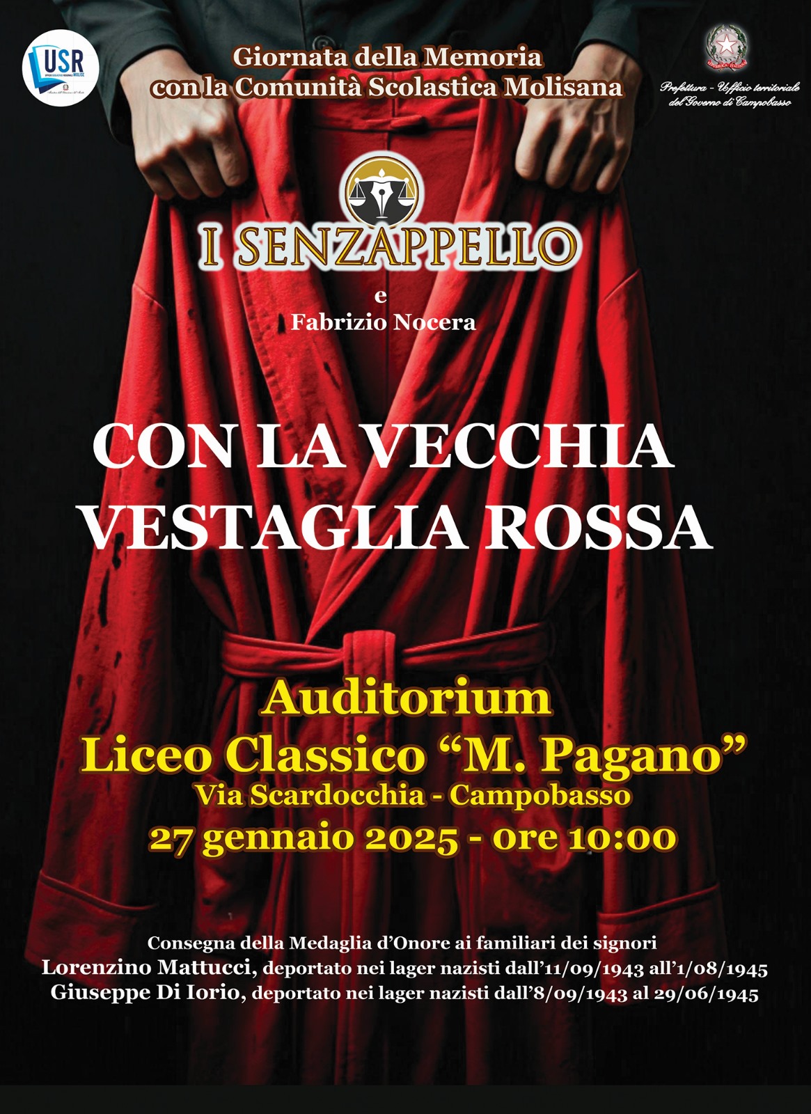 Protagonista della mattinata sarà lo spettacolo teatrale “Con la vecchia vestaglia rossa”, realizzato dall’associazione “Senzappello – Avvocati in teatro”. L’opera, frutto della collaborazione con lo storico Fabrizio Nocera, ripercorre le storie dimenticate dei cinque campi di internamento presenti in Molise, situati nei comuni di Campobasso, Casacalenda, Bojano, Vinchiaturo, Isernia e Agnone. Attraverso una narrazione intensa e coinvolgente, lo spettacolo offre un viaggio nel vissuto drammatico di quei luoghi e di quel periodo, trasportando studenti e docenti in una riflessione profonda sul valore della memoria e sul rispetto dei diritti umani.