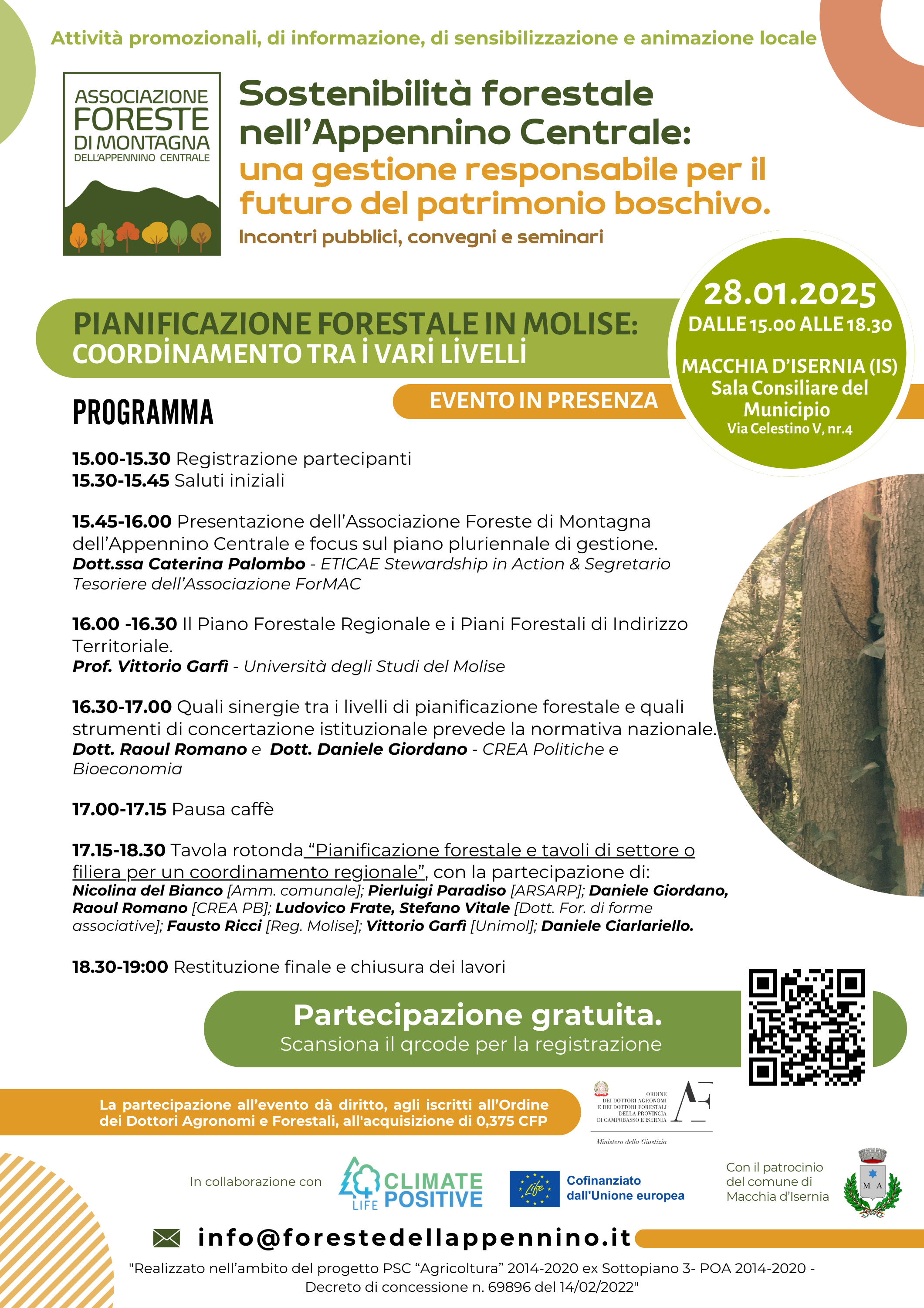 MACCHIA D’ISERNIA – L’Associazione Foreste di Montagna dell’Appennino Centrale invita tutti gli interessati a partecipare al convegno “La pianificazione forestale in Molise: coordinamento tra i vari livelli”, che si terrà il 28 gennaio a partire dalle ore 15:00 presso la Sala Consiliare del Comune.