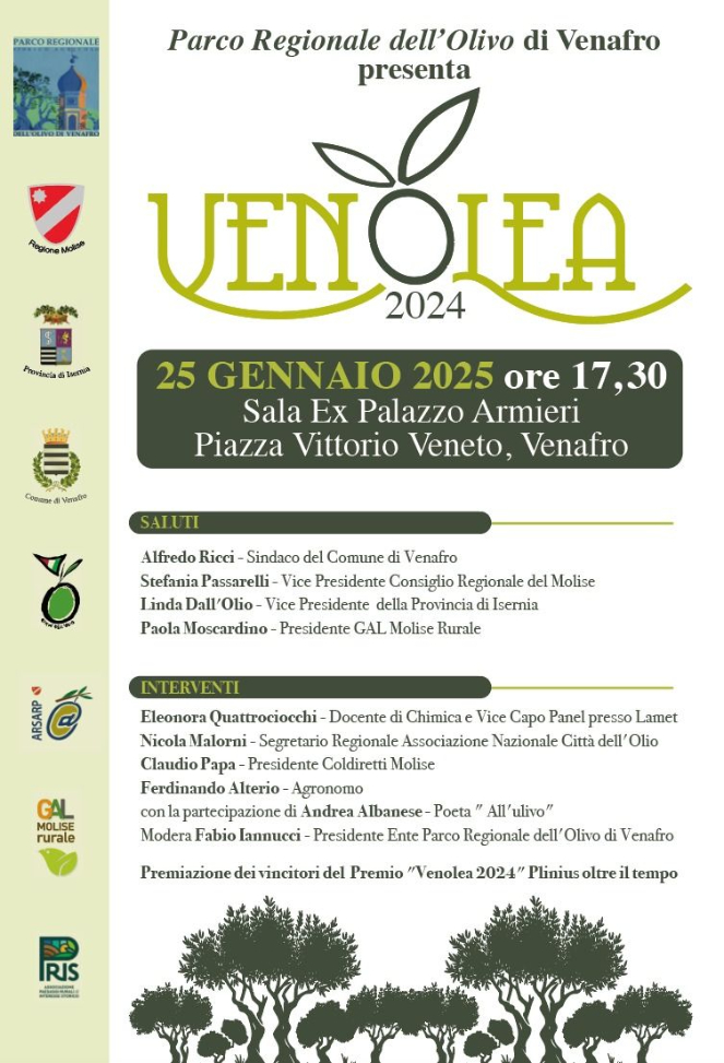 A promuovere ed organizzare l’evento è l’Ente Parco Regionale dell’Olivo di Venafro con le premiazioni del Concorso Venolea 2025 – Plinius oltre il tempo” e la partecipazione speciale di Andrea Albanese giovane studente poeta venafrano dell’istituto omnicomprensivo “A.Giordano” di Venafro che ha composto una poesia “All’ulivo”.