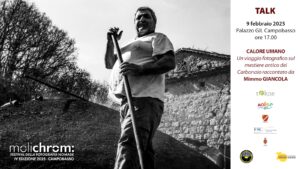 Molichrom: festival della fotografia nomade accoglie tra i suoi talk la presentazione del progetto “Calore Umano” del fotografo molisano Mimmo Giancola che, sostenuto dalle associazioni fotografiche A.C.F. “Sei Torri – Tommaso Brasiliano” e il Centro per la fotografia Vivian Maier, insieme a Eliana Marinelli, racconterà le immagini  scattate per quattro anni durante le faticose stagioni di una famiglia di carbonai in un cantiere sulle pendici di Monte Vairano a Busso, in provincia di Campobasso.