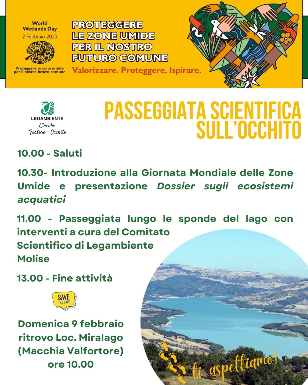 CAMPOBASSO – Domenica 9 febbraio 2025, in occasione della Giornata Mondiale delle Zone Umide, il Circolo Legambiente Fortore Occhito organizza la Passeggiata Scientifica sull’Occhito, un evento aperto al pubblico per sensibilizzare sull’importanza della tutela degli ecosistemi acquatici. Il ritrovo è fissato alle ore 10.00 presso la località Miralago a Macchia Valfortore.