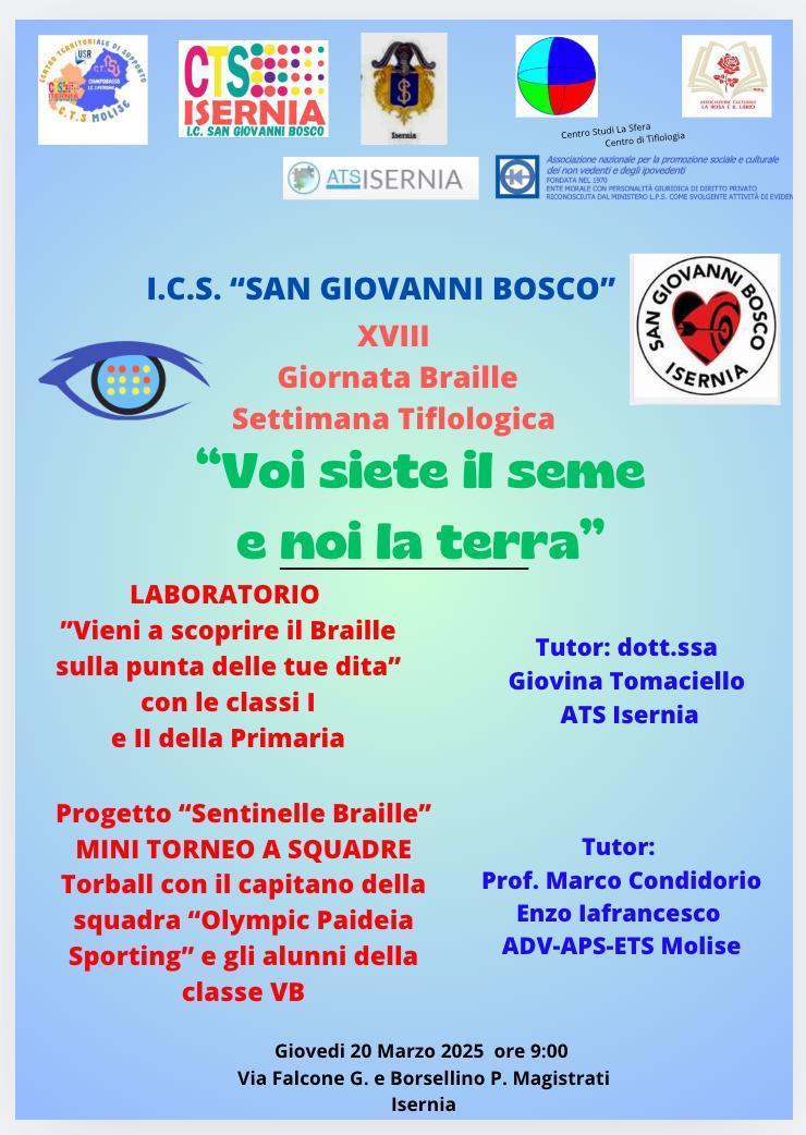 ISERNIA – Giovedì 20 marzo, in occasione della XVIII Giornata Mondiale dedicata al Braille e della Settimana della Tiflologia, il Centro di Supporto Territoriale (CTS) provinciale per l’inclusione scolastica, con sede presso l’I.C.S. San Giovanni Bosco di Isernia, ha organizzato un evento speciale dal titolo “Voi siete il seme e noi la terra”.