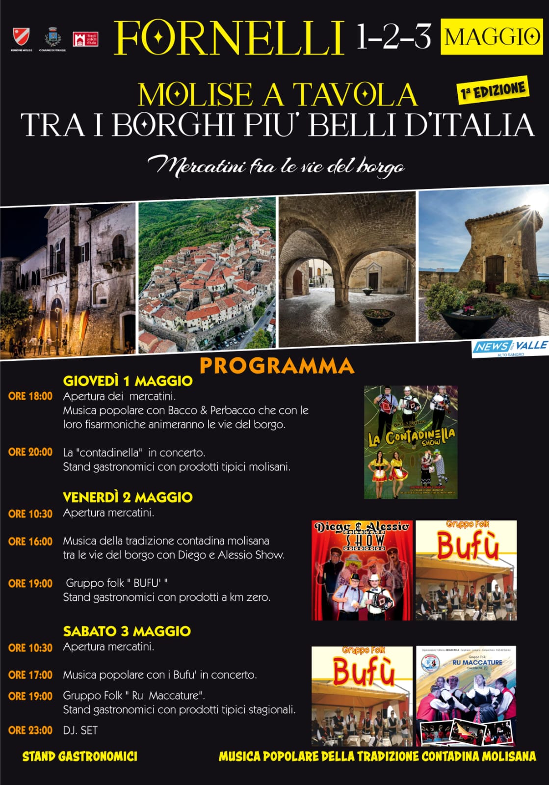 FORNELLI – Il Comune di Fornelli, con il patrocinio della Regione Molise, inaugura la prima edizione dell’evento enogastronomico “Molise a Tavola tra i Borghi più Belli d’Italia”.