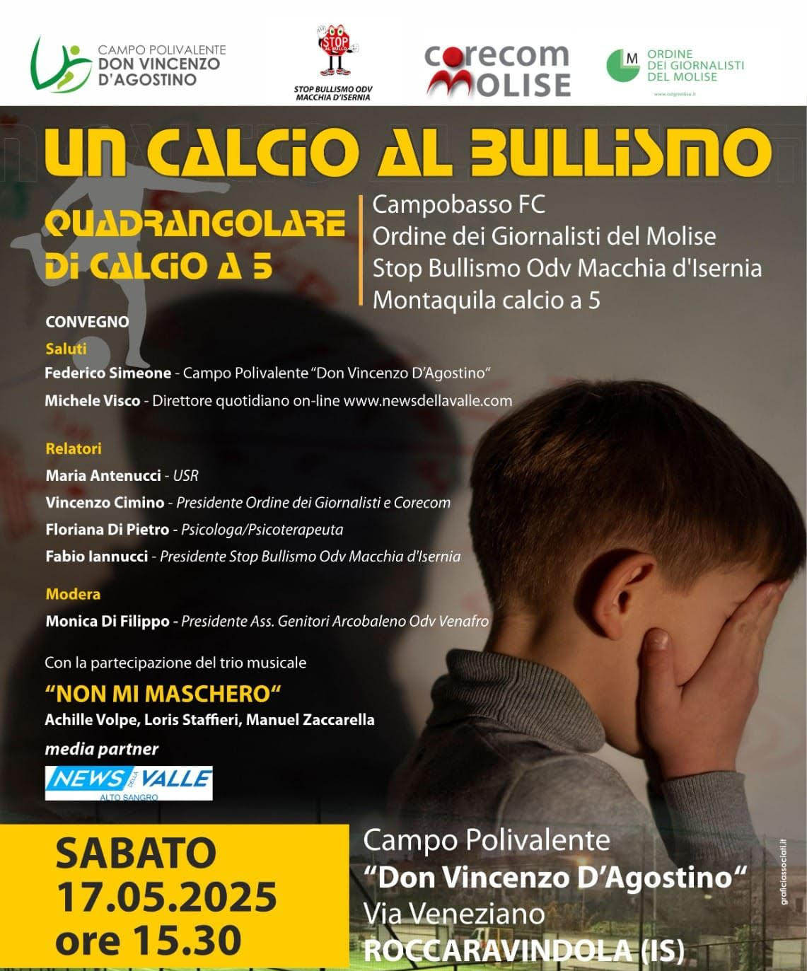 L’evento denominato “Un calcio al Bullismo” e’ promosso dai gestori della struttura sportiva, dall’Associazione Stop Bullismo ODV Macchia d’Isernia, dal Corecom Molise e dall’Ordine dei Giornalisti del Molise. Programma molto intenso.