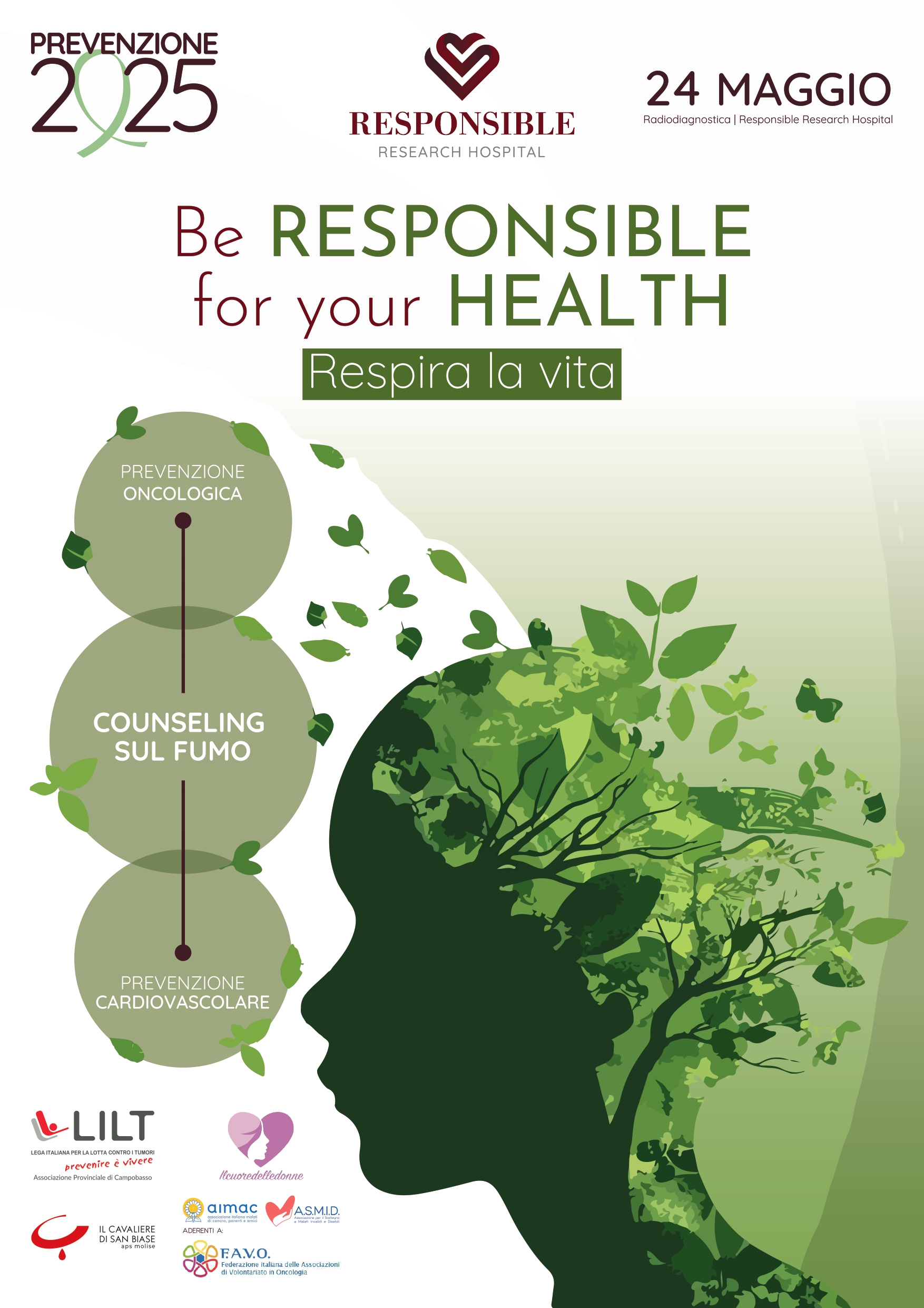 CAMPOBASSO – In occasione della Giornata Mondiale Senza Tabacco, che si celebra il 31 maggio su iniziativa dell’Organizzazione Mondiale della Sanità (OMS), il Responsible Research Hospital (RRH) e la LILT (Lega Italiana per la Lotta ai Tumori), in collaborazione con “Il Cuore delle Donne”, Il Cavaliere di San Biase, AIMAC – ASMID aderenti a FAVO, promuove una nuova tappa del progetto “Prevenzione 2025” con l’iniziativa: “Be Responsible for Your Health: Respira la Vita”.