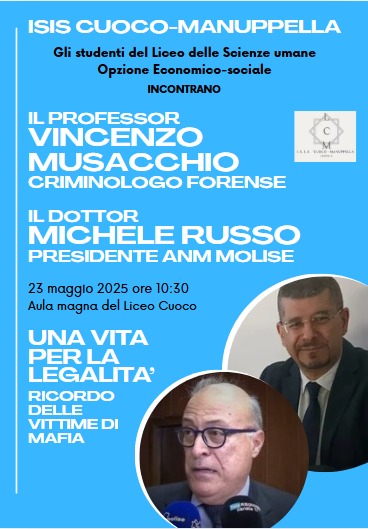 ISERNIA – Giornata della Legalità: gli studenti del Liceo Economico Sociale ‘Vincenzo Cuoco’ di Isernia incontrano il prof. Vincenzo Musacchio, criminologo forense, e il dottor Michele Russo, presidente Anm Molise, il 23 maggio prossimo, alle ore 10:30 nell’Aula Magna della scuola in via Leopardi 1.