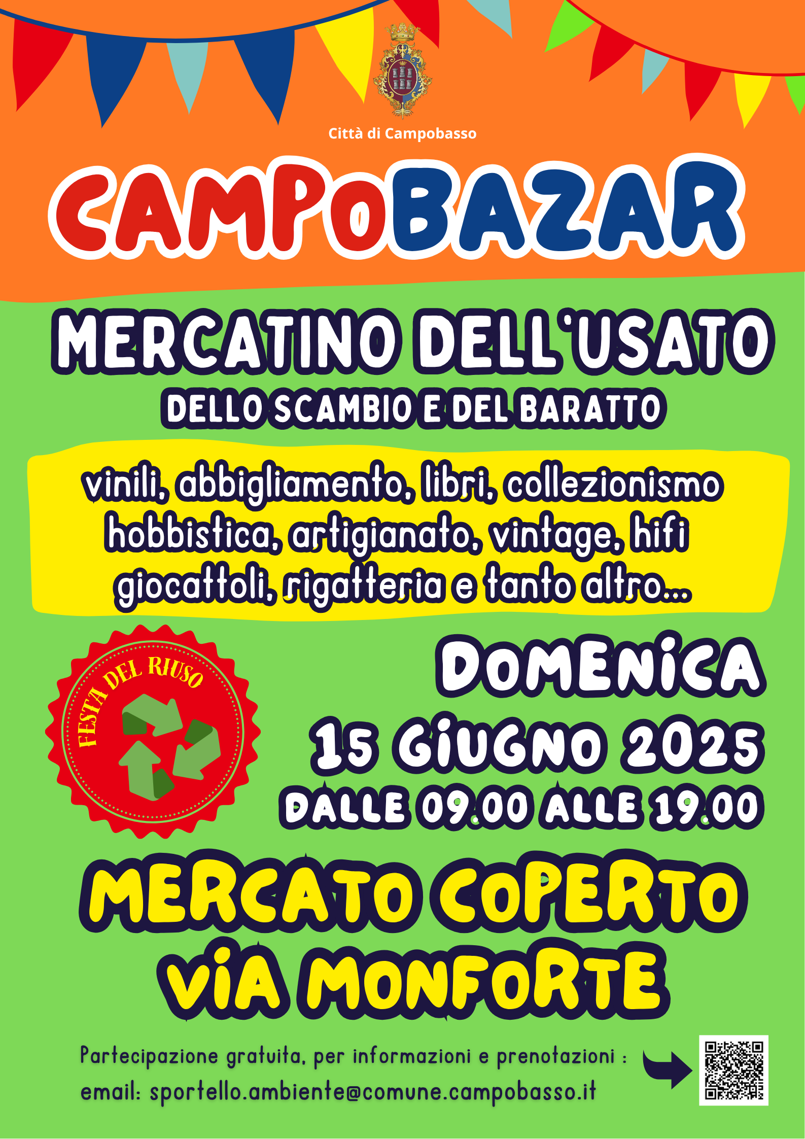 L’evento rappresenta non solo un’occasione per fare buoni affari e liberare spazio in casa, ma anche un momento di socializzazione e condivisione, in un clima informale e conviviale che valorizza le buone pratiche legate al riuso e al riciclo. La partecipazione a Campobazar è libera e gratuita, previa compilazione e invio dell’apposita istanza, disponibile sul sito ufficiale del Comune al seguente link: https://www.comune.campobasso.it/…/index/idtesto/20290 Le richieste di adesione devono essere inviate via e-mail all’indirizzo: sportello.ambiente@comune.campobasso.it