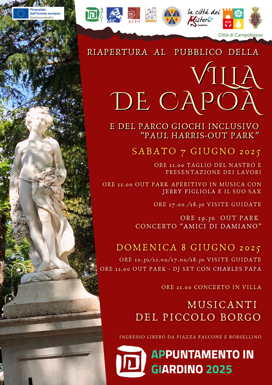 CAMPOBASSO – Villa De Capoa torna a vivere, definito il programma dell’evento in calendario per sabato 7 e domenica 8 giugno 2025, in occasione della manifestazione nazionale “Appuntamento in Giardino”, promossa dall’Associazione Parchi e Giardini d’Italia.