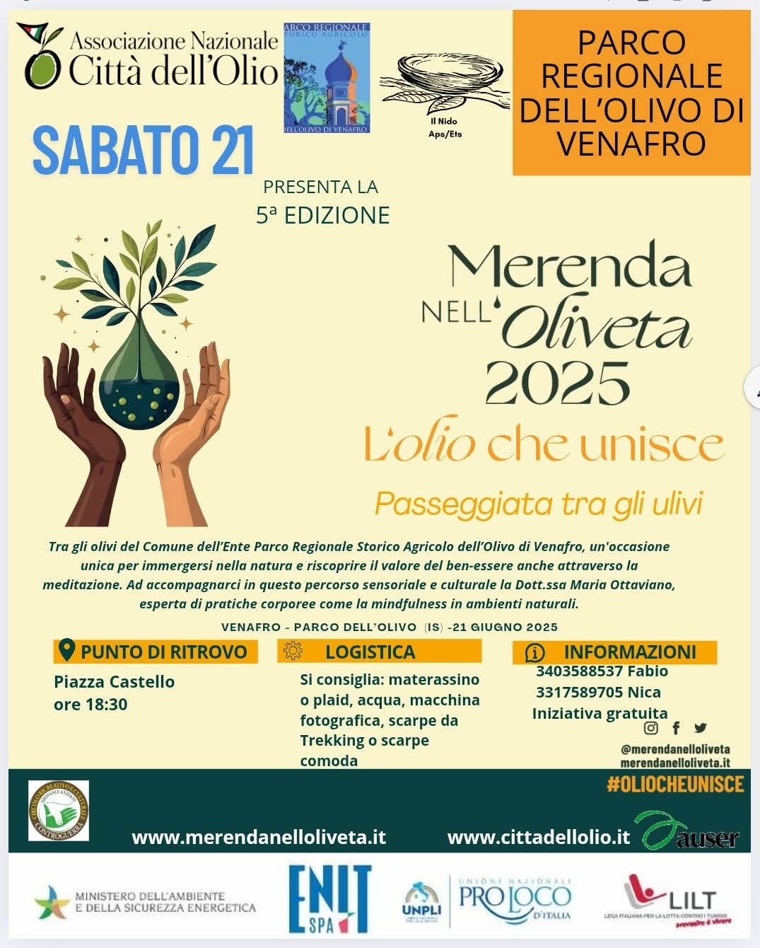 L’iniziativa, promossa da “Città dell’Olio” nell’ambito di “Merenda nell’Oliveta 2025”, mira a favorire il benessere fisico e mentale attraverso il contatto diretto con la natura. A guidare i partecipanti in questa esperienza sensoriale sarà la dottoressa Maria Ottaviano, psicologa e psicoterapeuta esperta in pratiche corporee.
