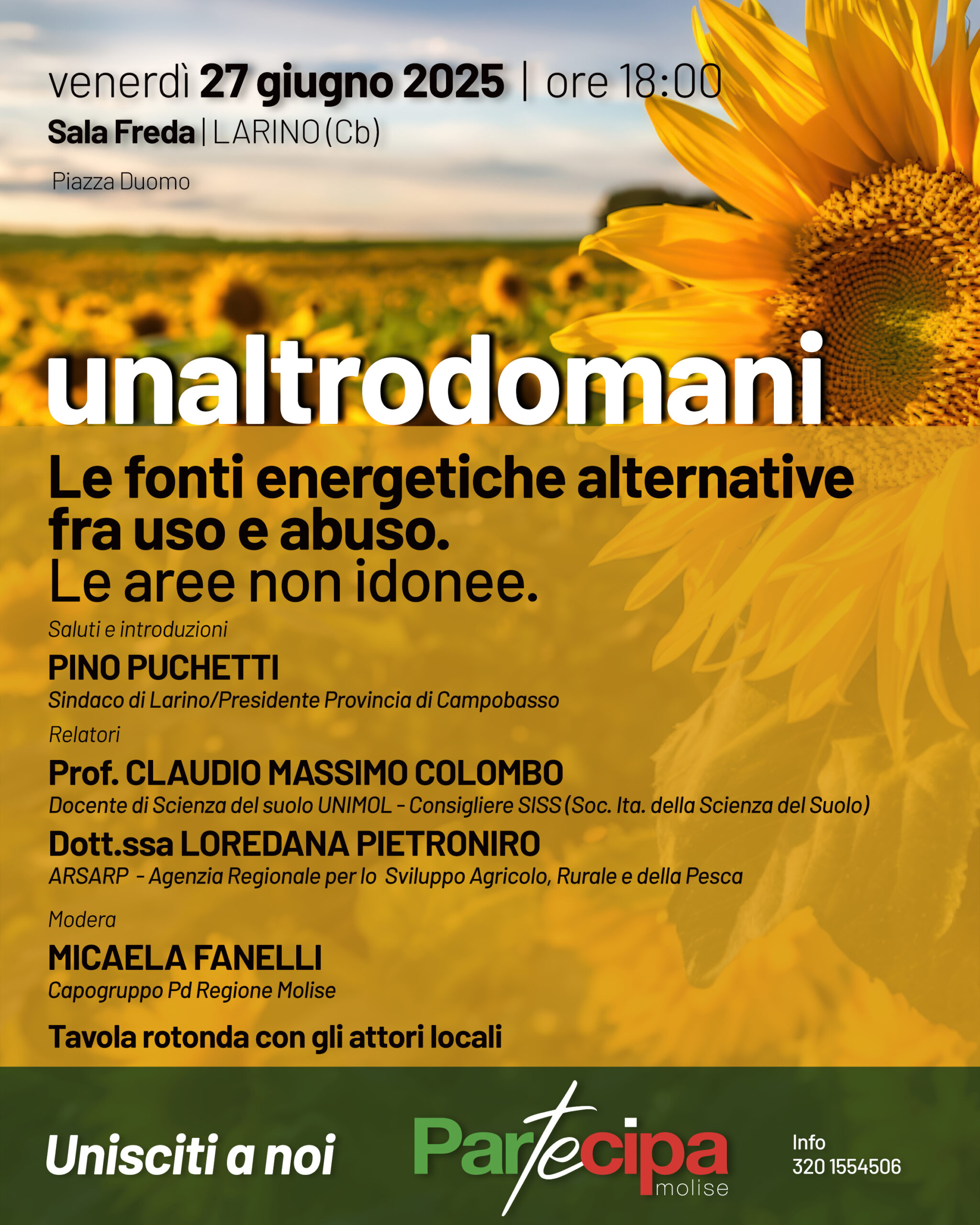 A conclusione degli interventi, si terrà una tavola rotonda con gli attori locali, per raccogliere istanze e proposte direttamente dal territorio e favorire un dialogo partecipato sulle politiche energetiche e di tutela del paesaggio. L’Associazione Partecipa Molise invita la cittadinanza a prendere parte a questo appuntamento fondamentale per costruire un “Un altro domani” più consapevole e sostenibile per la regione.
