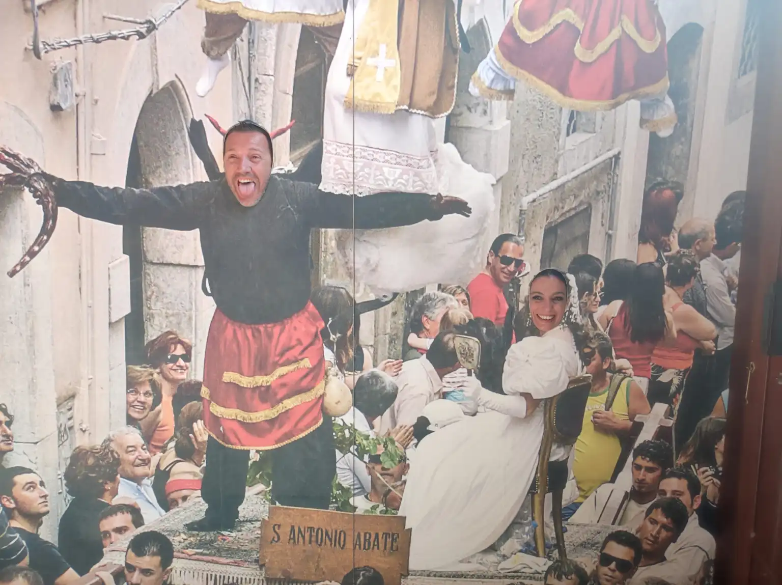 Un video di sei minuti ha ripercorso la storia della manifestazione dal 1929 a oggi, in un viaggio emozionante fatto di volti, gesti e devozione popolare. Poi il momento più “social”: un selfie accanto alla sagoma del carro di Sant’Antonio Abate, una delle figure più amate della processione e simbolo di protezione e semplicità contadina.