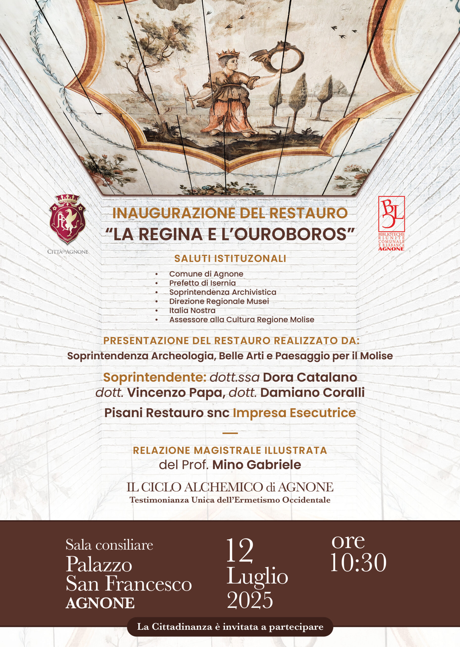Dopo i saluti istituzionali, interverrà anche il Professor Mino Gabriele, promotore del restauro, che terrà una relazione magistrale dal titolo “Il ciclo alchemico di Agnone – Testimonianza unica dell’ermetismo occidentale”.