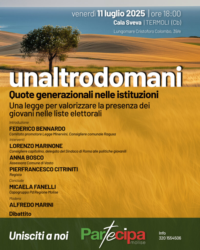 L’Associazione Politico-Culturale “Partecipa Molise” è lieta di annunciare un dibattito pubblico incentrato sui temi delle “Quote Generazionali nelle Istituzioni” e della proposta di legge “Guglielmo Minervini”. L’evento si terrà venerdì 11 luglio a Termoli, presso Cala Sveva, con inizio alle ore 18:00 a conclusione delle attività di “Un altro domani”, ciclo di conferenze territoriali nel Basso Molise.