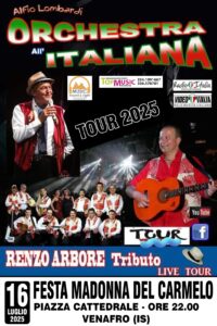 La sera della festa del Carmine, il 16 luglio, si esibirà l’Orchestra all’Italiana, la Tribute Band ufficiale ideata da Alfio Lombardi con l’obiettivo di portare avanti la tradizione di Renzo Arbore nel reinterpretare in chiave moderna la canzone napoletana. Una formazione che nasce come continuazione della storica ‘Orchestra Italiana’ del musicista pugliese che la lanciò per promuovere la melodia partenopea attraverso variegate contaminazioni musicali, come il jazz, lo swing, il blues. La serata si concluderà con i consueti fuochi pirotecnici nella Villa Comunale.