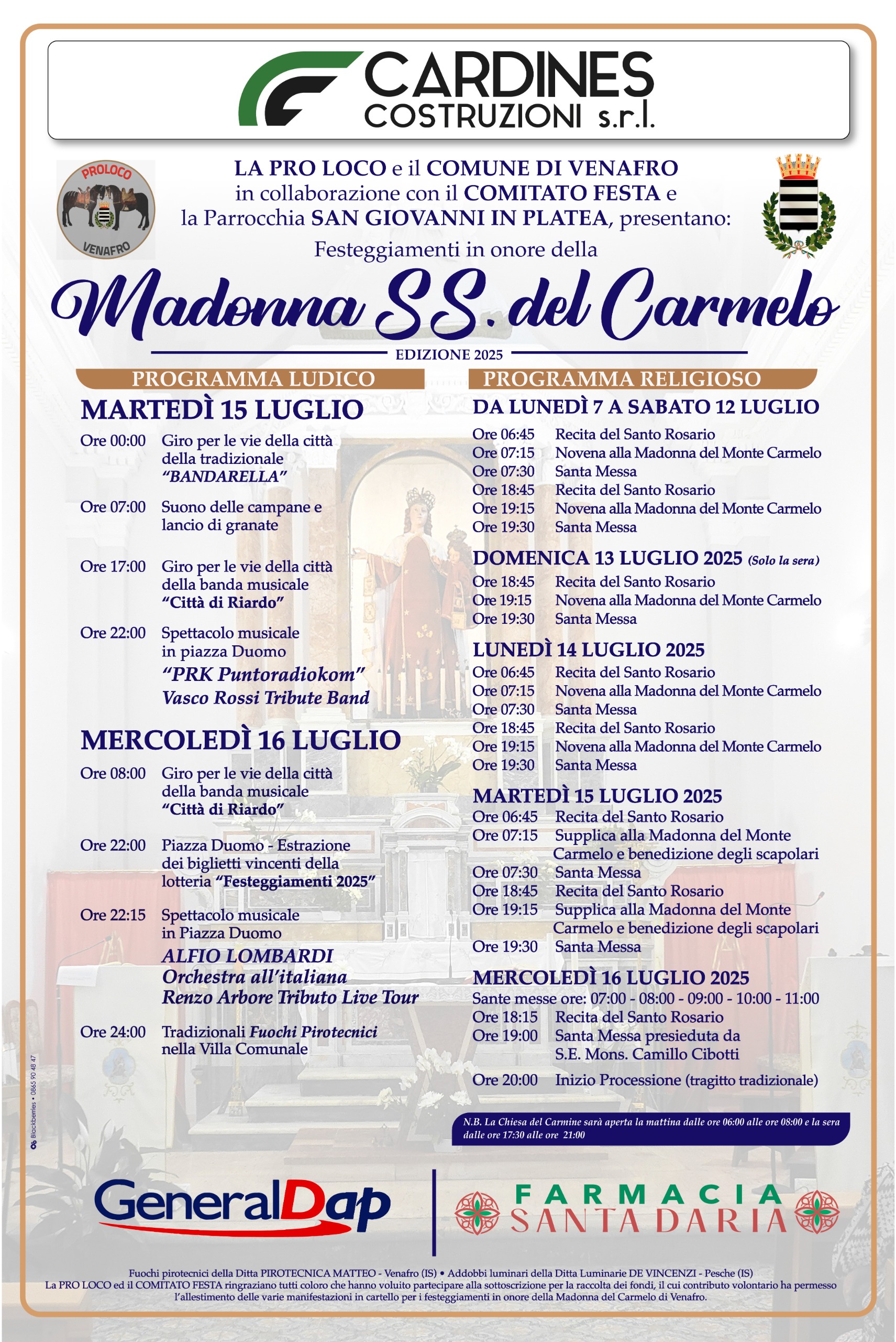 La Pro Loco e il Comune di Venafro in collaborazione con il Comitato Festa, la Parrocchia San Giovanni in Platea e il patrocinio del Comune di Venafro, presentano dunque il programma ludico e religioso dell’edizione 2025.