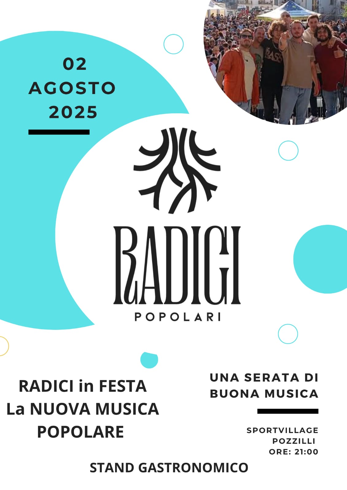 Protagonisti della serata i RADICI POPOLARI, con il loro travolgente spettacolo “Radici in Festa – La Nuova Musica Popolare”. Un viaggio sonoro tra tradizione e modernità, pensato per far ballare, cantare e vivere la musica nel cuore del Molise.