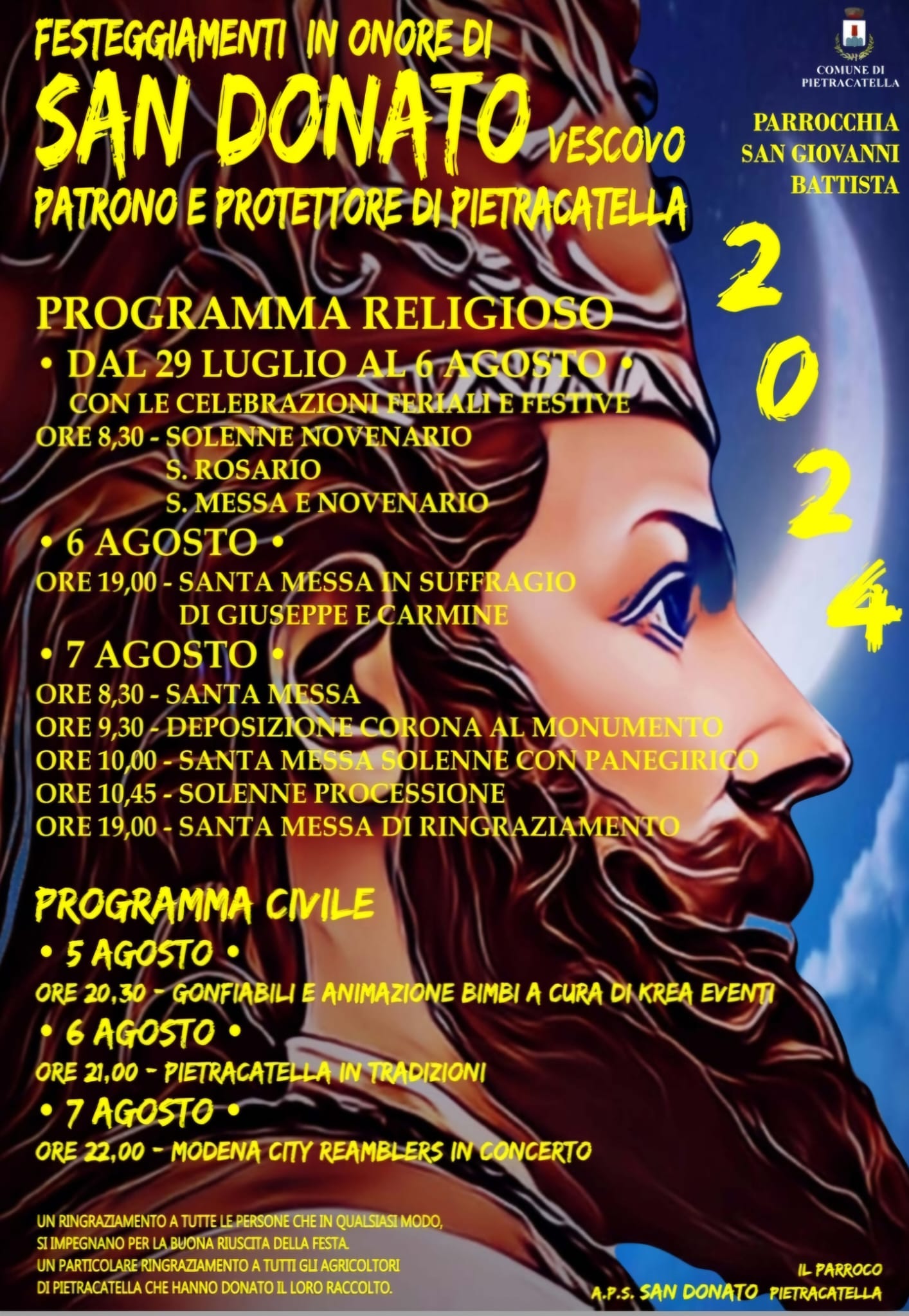 Ad organizzare i festeggiamenti è l’Associazione S. Donato APS, in collaborazione con il Comune di Pietracatella e la Parrocchia di San Donato.