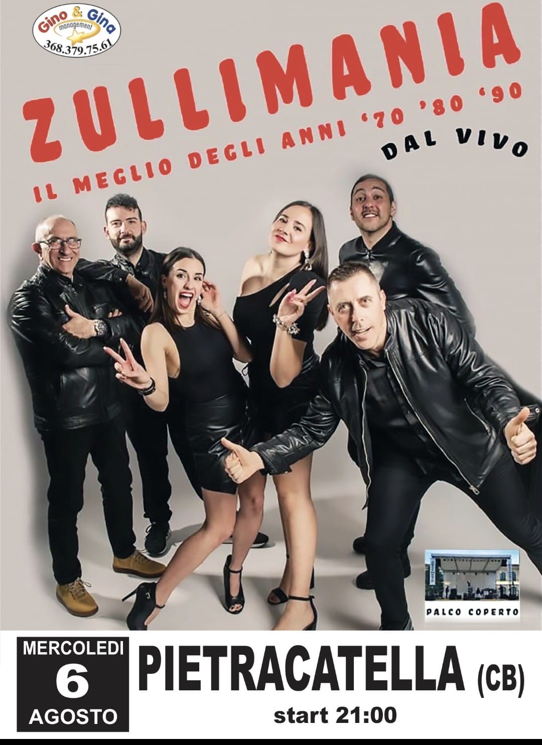 - Il 6 agosto spazio alla musica italiana e internazionale con la Zullimania Band, che farà rivivere i grandi classici dagli anni ’60 ai ’90.