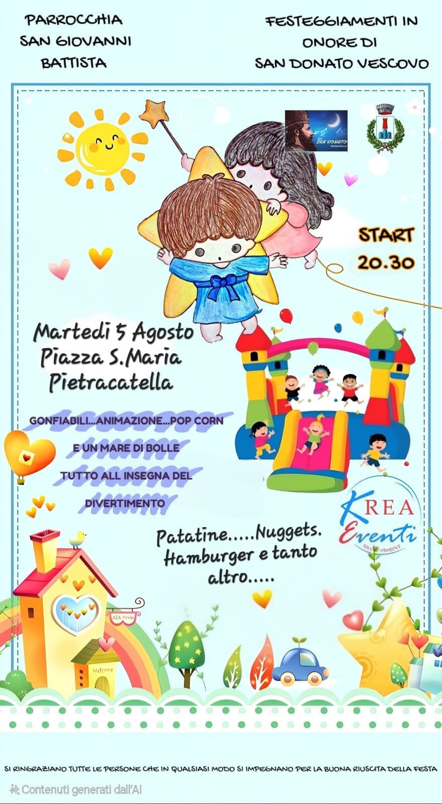 PIETRACATELLA – Il borgo fortorino si prepara a vivere uno degli appuntamenti più attesi dell’estate: la festa in onore del patrono San Donato che si svolgerà dal 5 al 7 agosto 2025 con un ricco programma di eventi pensati per tutte le generazioni.