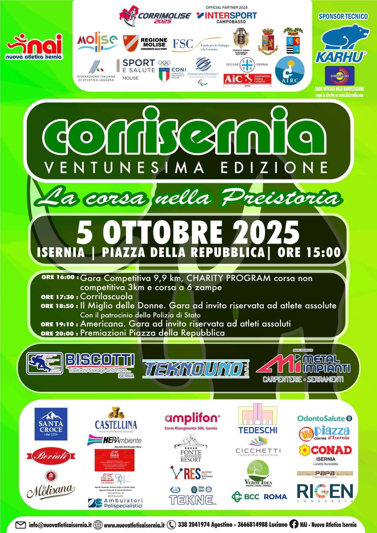 Fondamentali le collaborazioni con il Comune di Isernia, l’Assessorato allo Sport della Regione Molise, le aziende sponsor — storiche e nuove — e il mondo scolastico, che contribuiscono a rendere CorrIsernia un appuntamento atteso e partecipato.