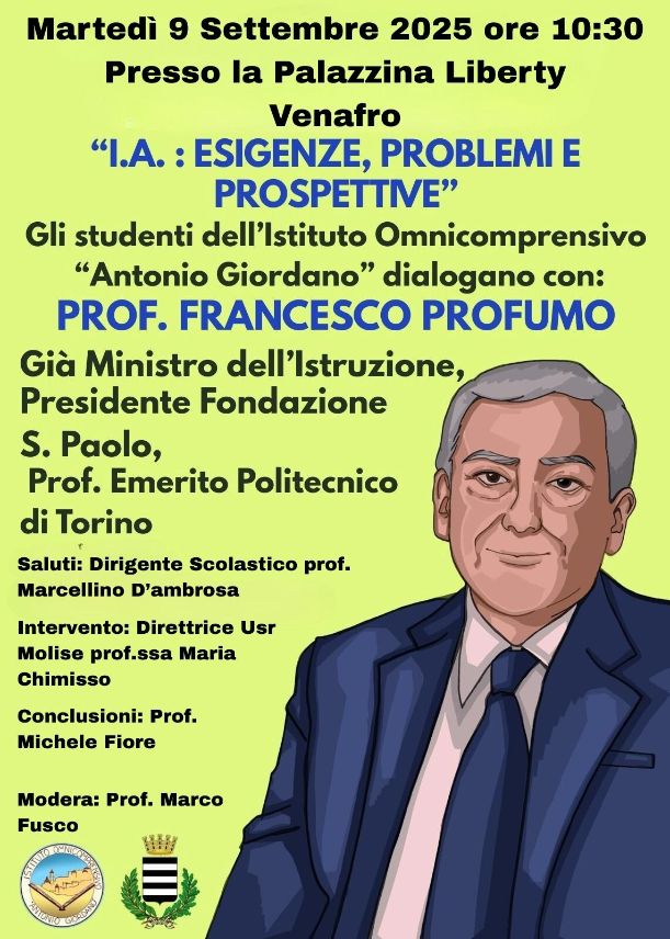 VENAFRO – Sarà un inizio d’anno scolastico all’insegna dell’innovazione e del confronto quello previsto per martedì 9 settembre 2025, quando la città di Venafro ospiterà l’ex Ministro dell’Istruzione Francesco Profumo.