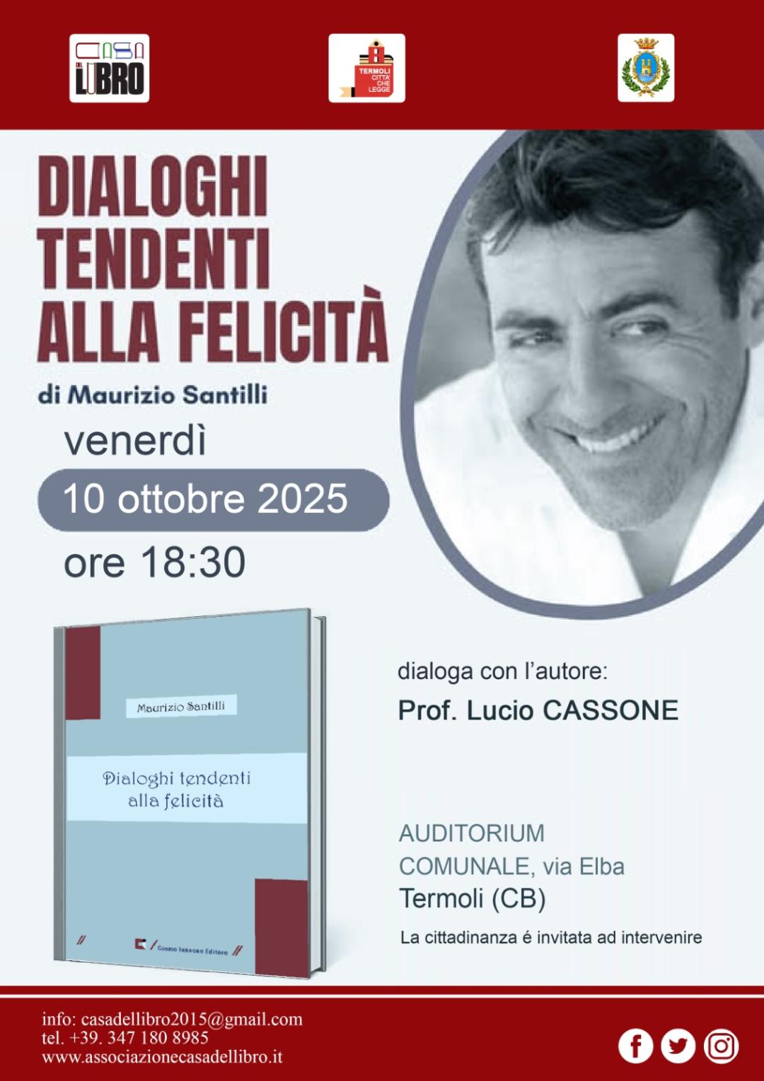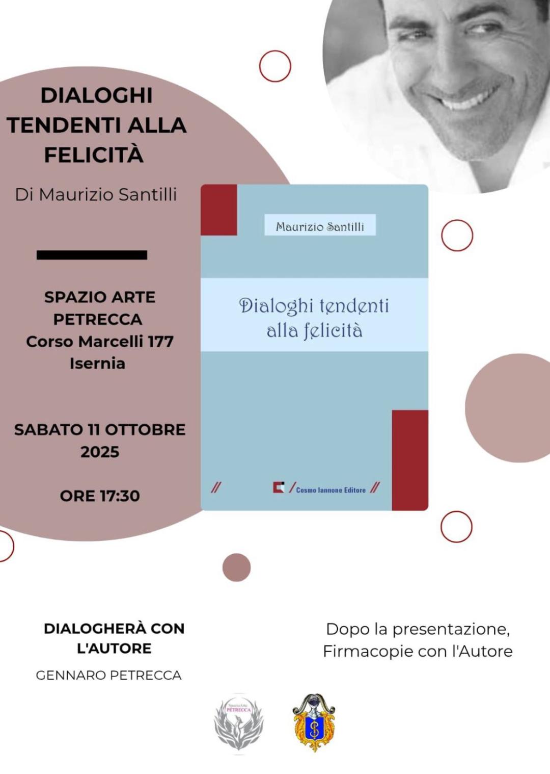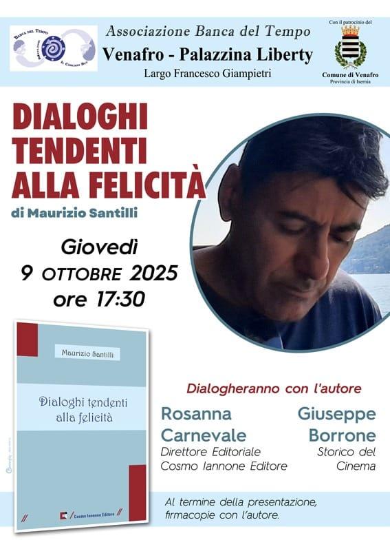 Dopo l’appuntamento inaugurale di Venafro, Santilli presenterà il volume «Dialoghi tendenti alla felicità» (Cosmo Iannone Editore) venerdì 10 ottobre all’Auditorium comunale di Termoli, in dialogo con Lucio Cassone. La tre giorni si concluderà sabato 11 ottobre a Isernia, presso lo Spazio Arte Petrecca, dove l’attore si confronterà con Gennaro Petrecca.