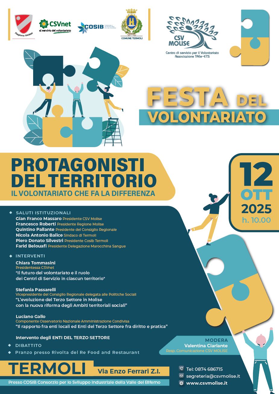 Domenica 12 ottobre 2025, a partire dalle ore 10, nella sede del Cosib di Termoli, il Consorzio per lo sviluppo industriale per la valle del Biferno, si svolgerà l’evento dal titolo ‘Protagonisti del territorio: il volontariato che fa la differenza’.