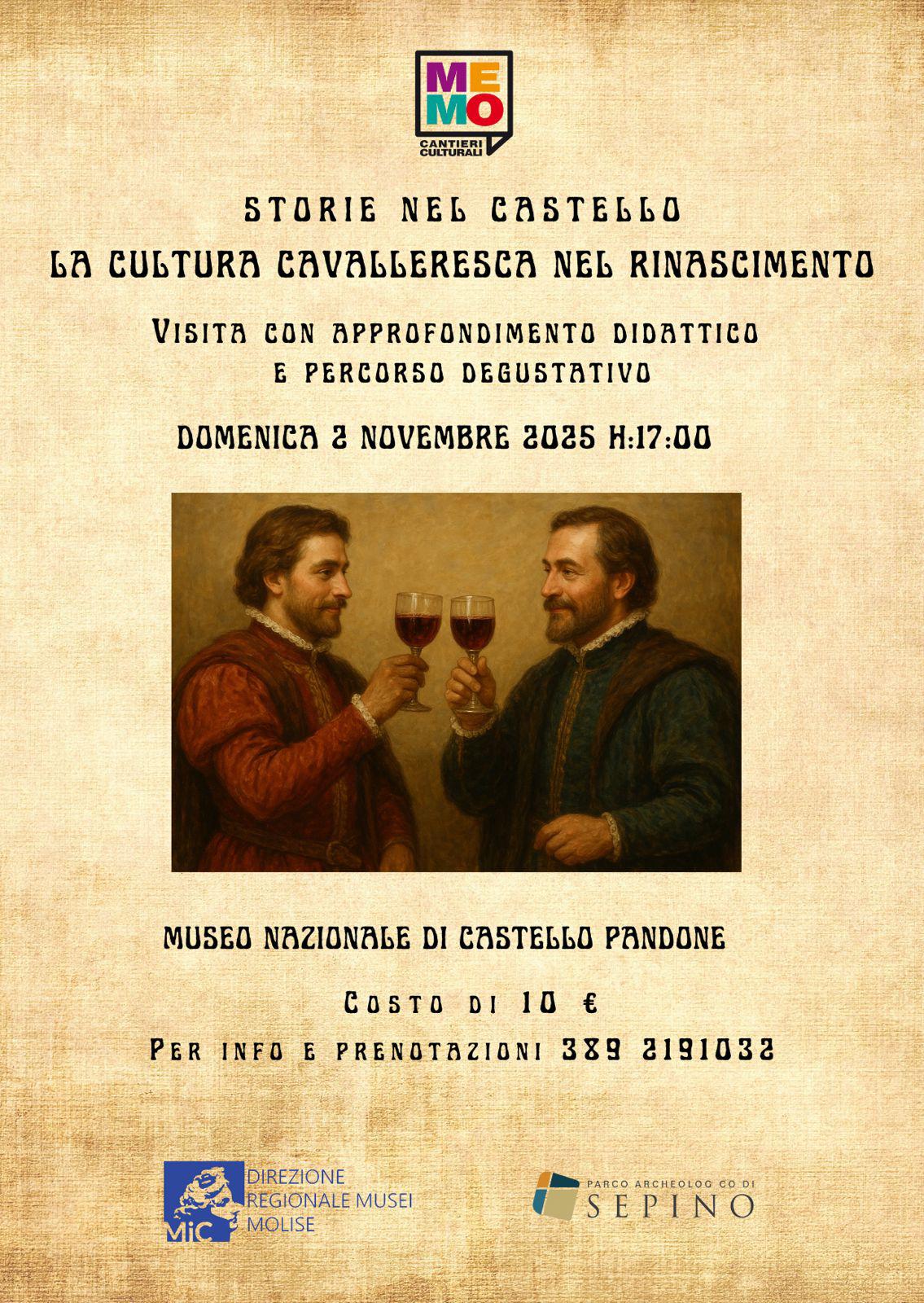 Organizzato da MEMO con il patrocinio della Direzione Regionale Musei Molise e del Parco Archeologico di Sepino, l’incontro prevede una visita guidata con approfondimento didattico dedicato alla cultura cavalleresca, ai suoi valori e alle sue rappresentazioni nel periodo rinascimentale. A seguire, i partecipanti potranno vivere un percorso degustativo ispirato all’epoca, per un’esperienza che coinvolge mente e palato.